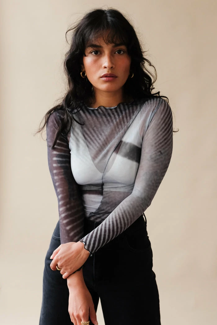 Nin Studio Asteroid Swirl mesh long sleeve top. Inspired by the unconscious and conscious in constant communication, The Swirl Top is a hypnotic mix between mesh fabrics. This shirt is long sleeve and can be layered or worn on its own. Lettuce hem