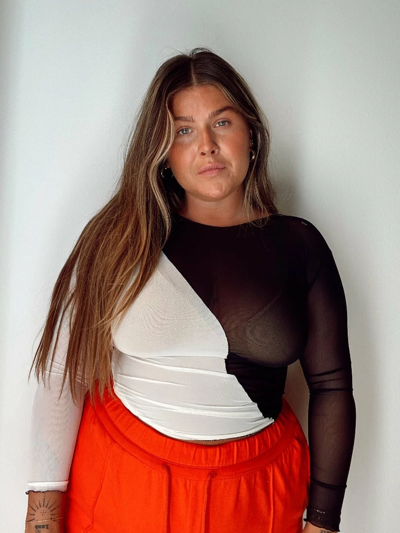 Nin Studio Swirl mesh long sleeve black and ivory top. Inspired by the unconscious and conscious in constant communication, The Swirl Top is a hypnotic mix between mesh fabrics. This shirt is long sleeve and can be layered or worn on its own. Lettuce hem.