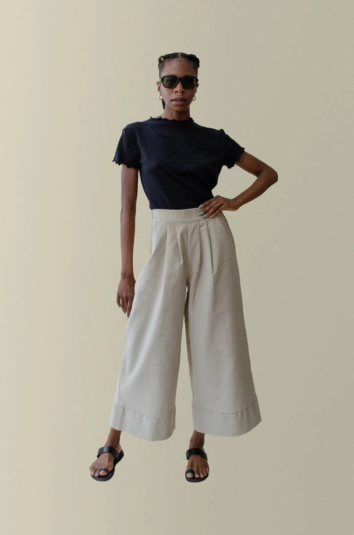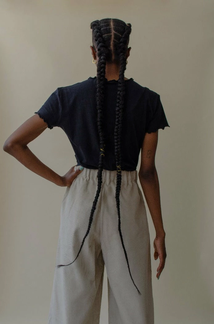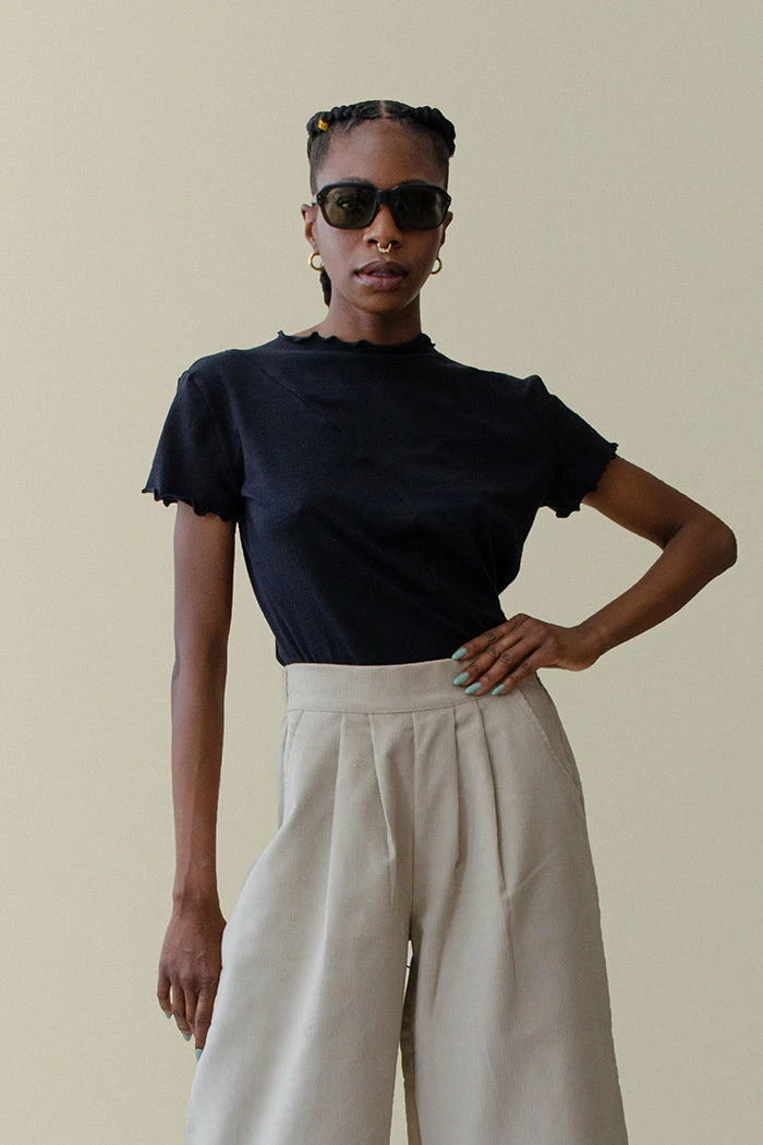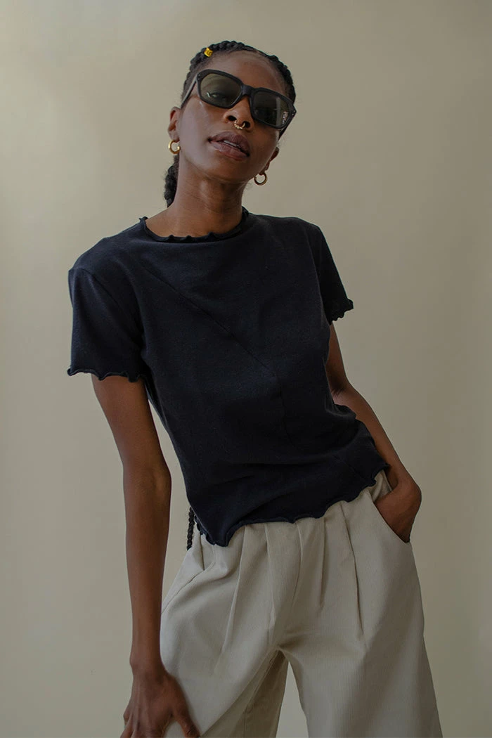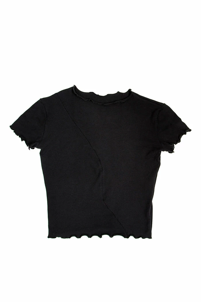 Nin Studio cotton swirl tee in solid black with seam detail diagonal across body. Inspired by the unconscious and conscious in constant communication. This shirt is short sleeve and can be layered or worn on its own. Lettuce hem.