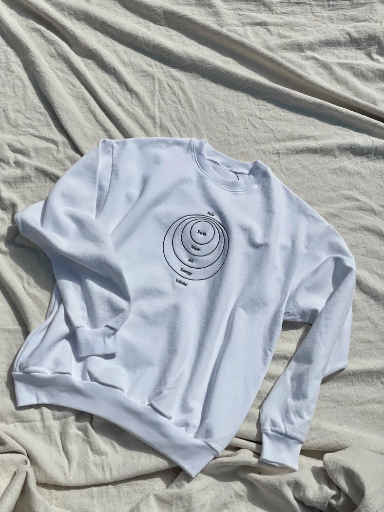 Palo Santo Studio Energetics Sweatshirt in white with dark green embroidery. Oversized classic crewneck in a vintage-inspired garment wash.