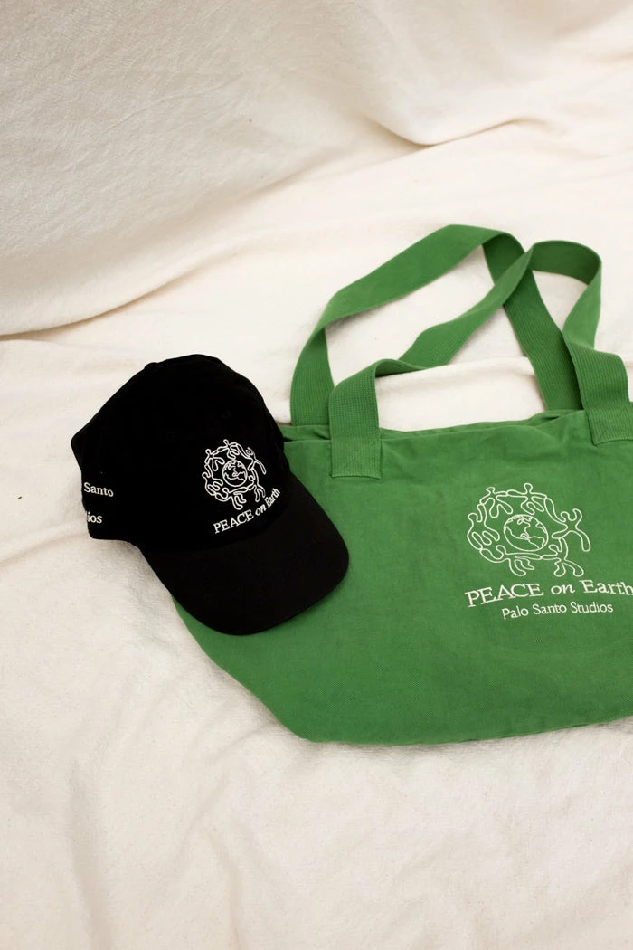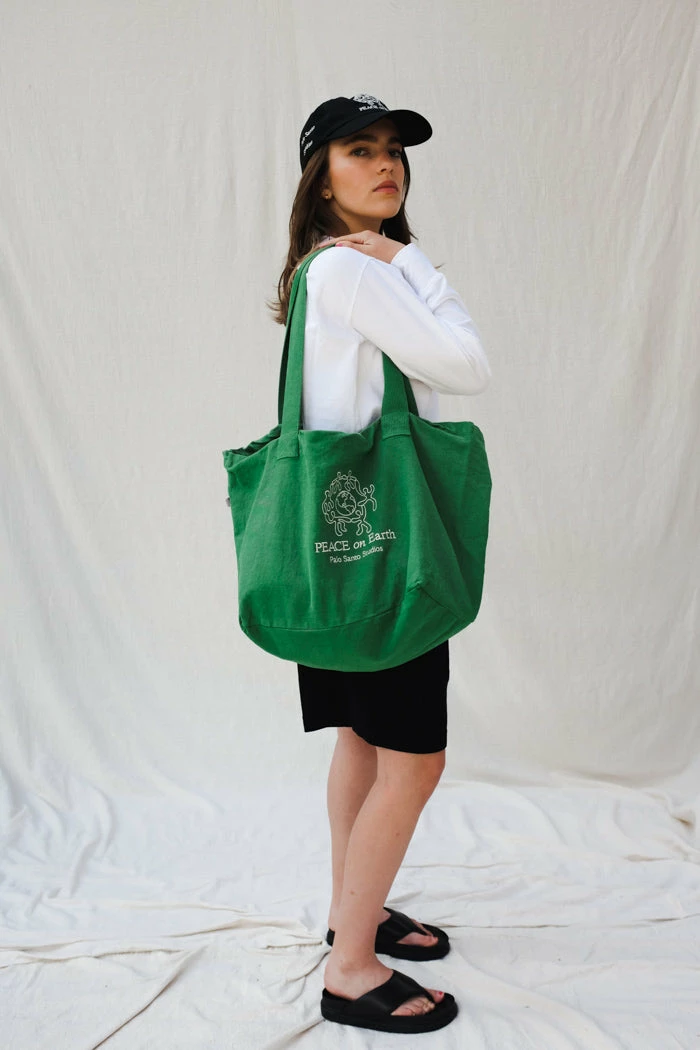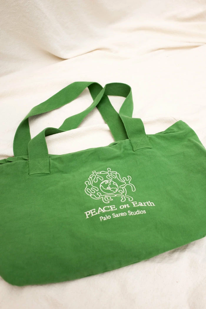 Palo Santo Studios large oversized canvas tote bag in veggie kelly green with ivory peace on earth embroidery.Â