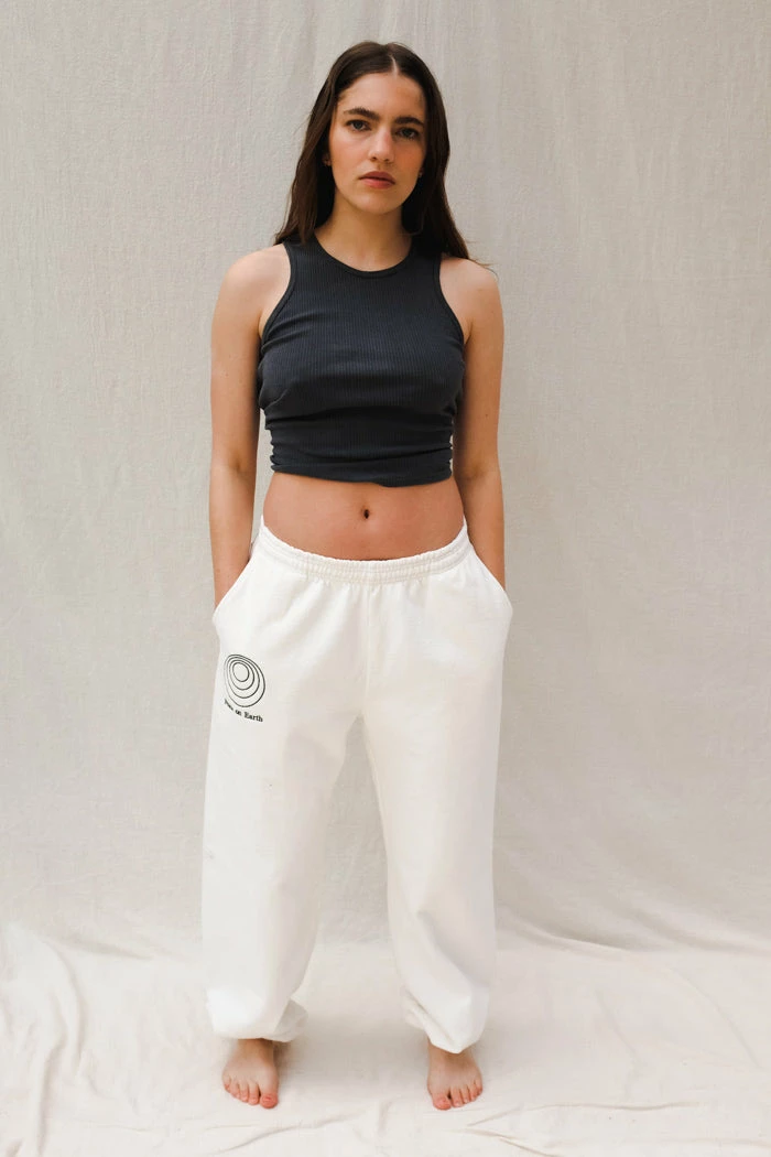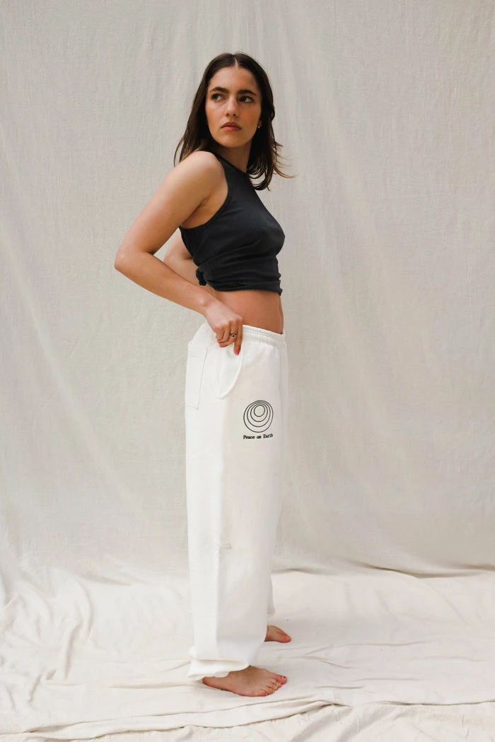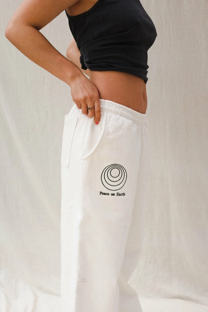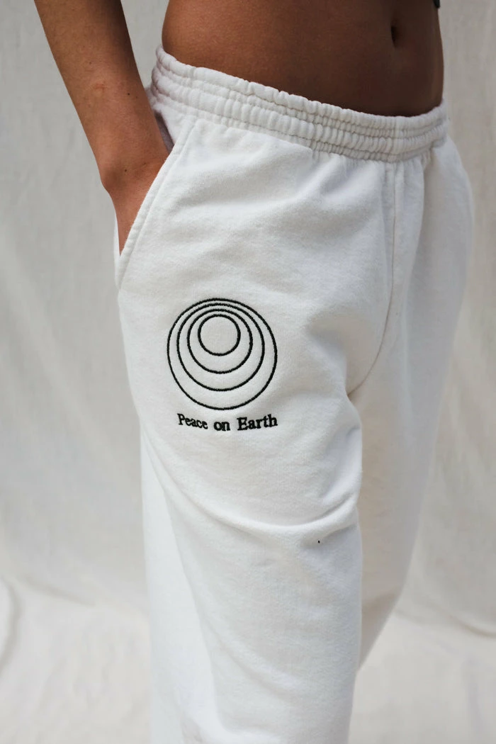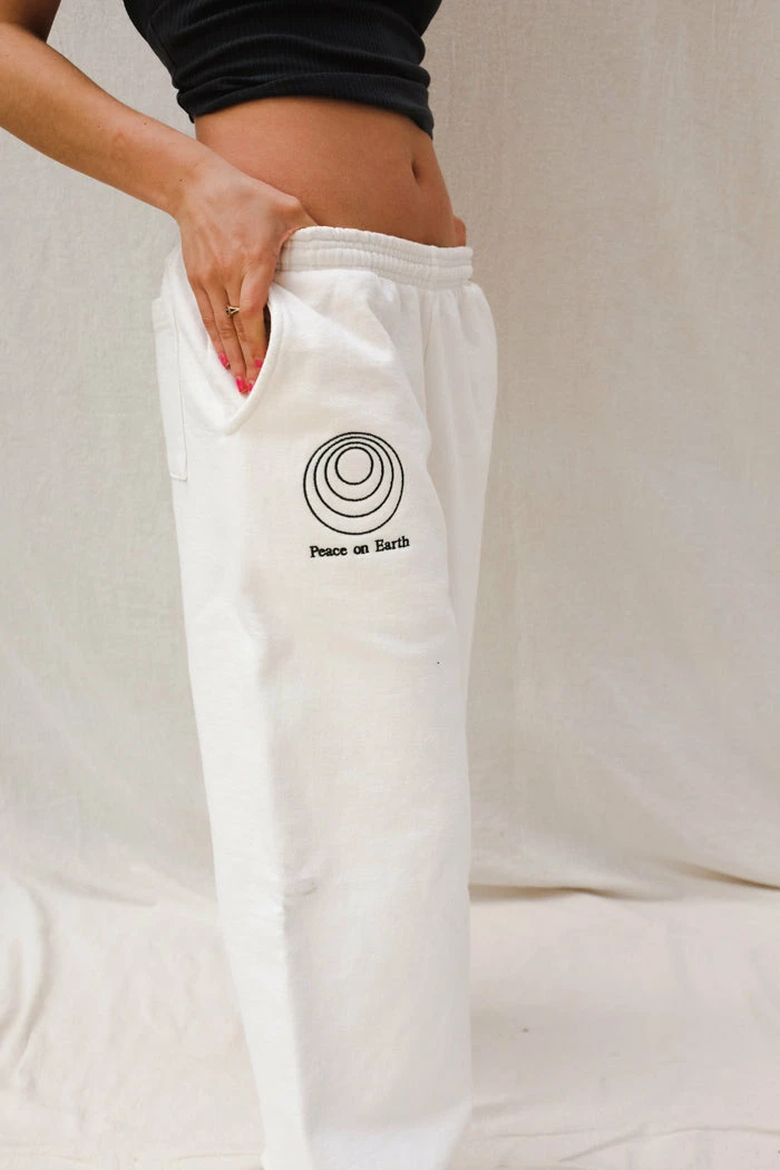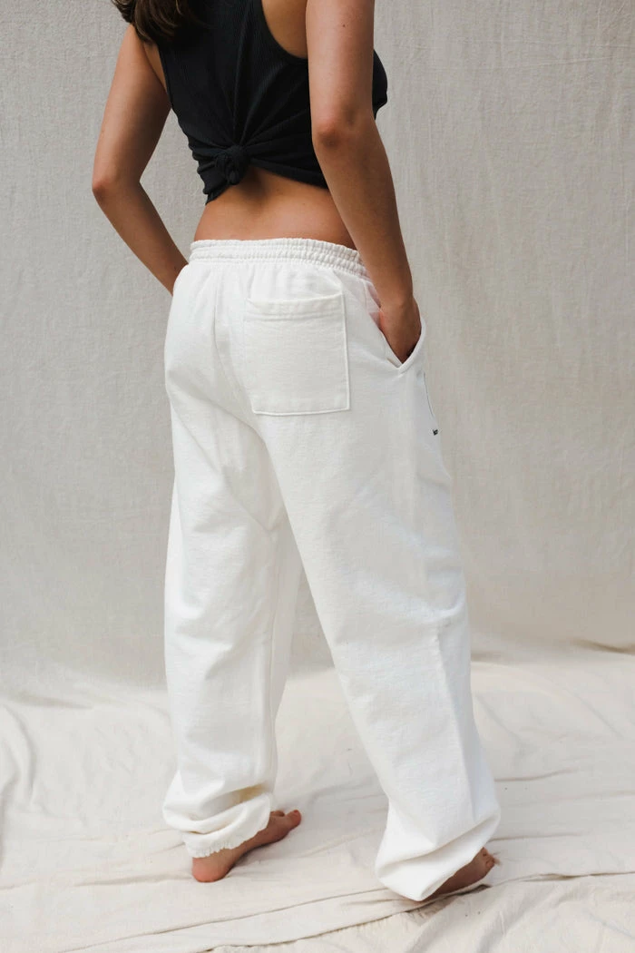 Palo Santo Studio unisex energetics off white eggshell sweatpants with green embroidery. These sweatpants will wear in beautifully with age. They will expand and contract as you wear and wash, and there is an adjustable drawstring to tighten and loosen the waist.