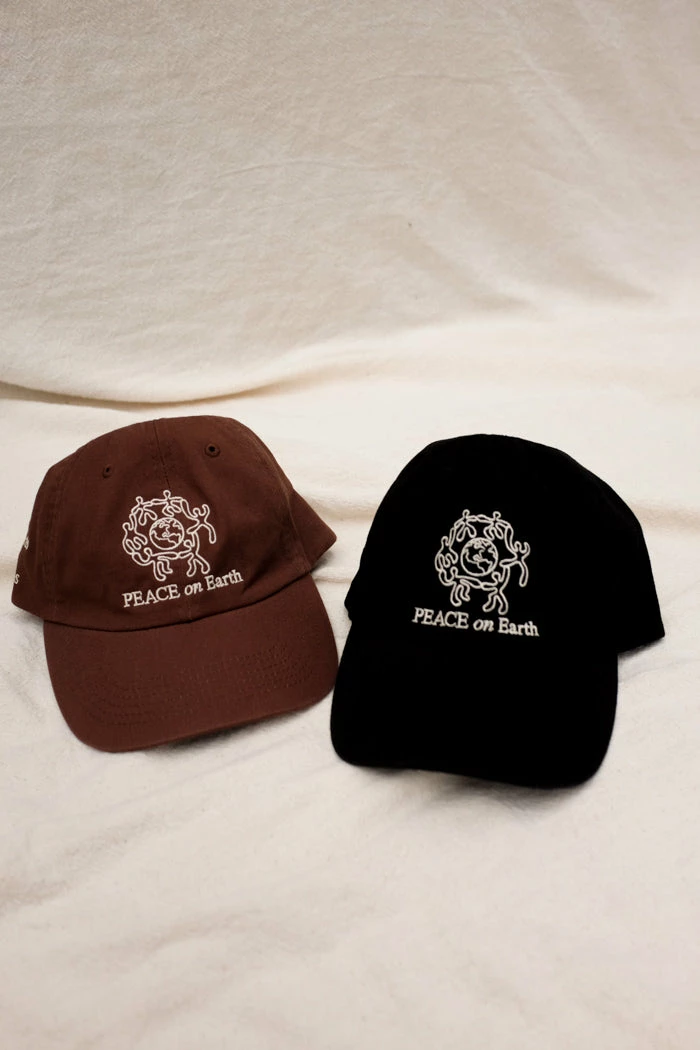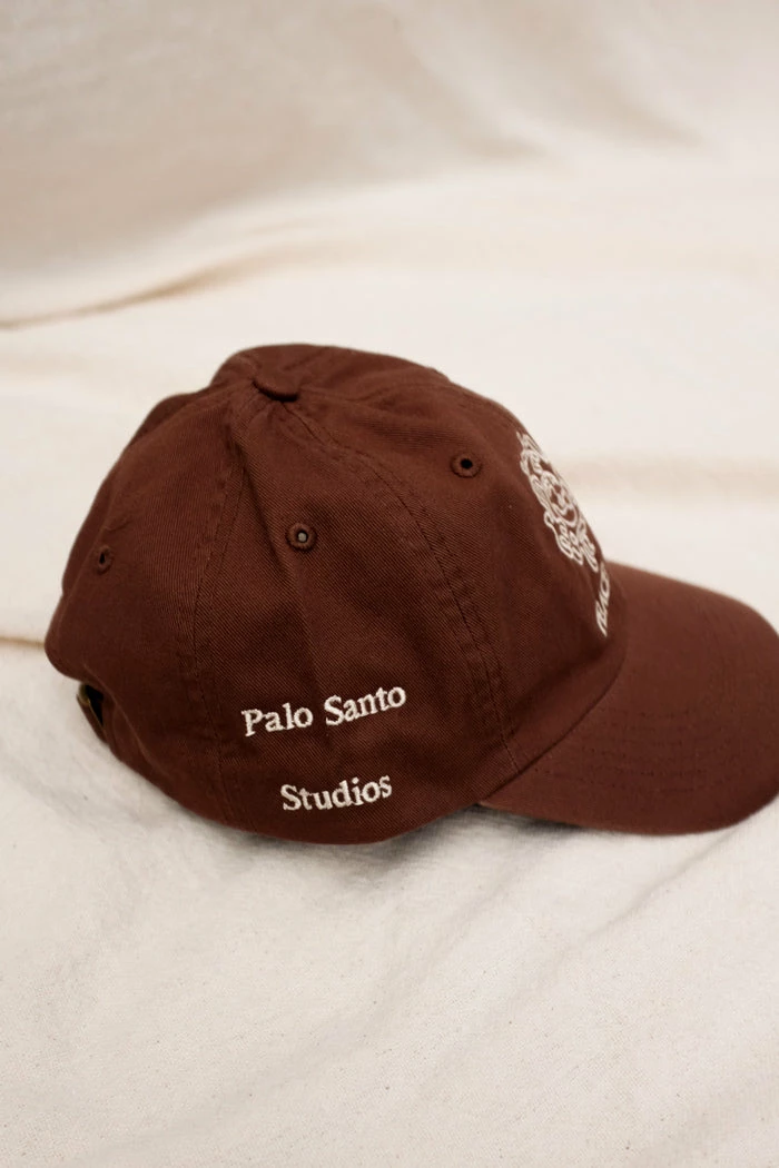 Palo Santo Studio espresso brown hat with white embroidery of peace people.