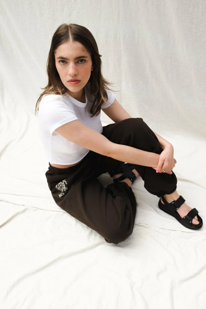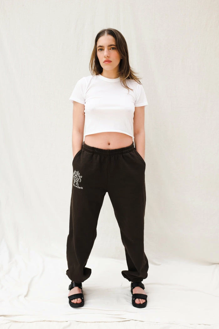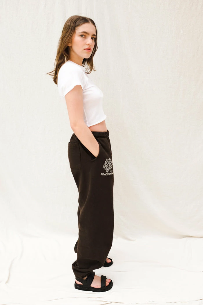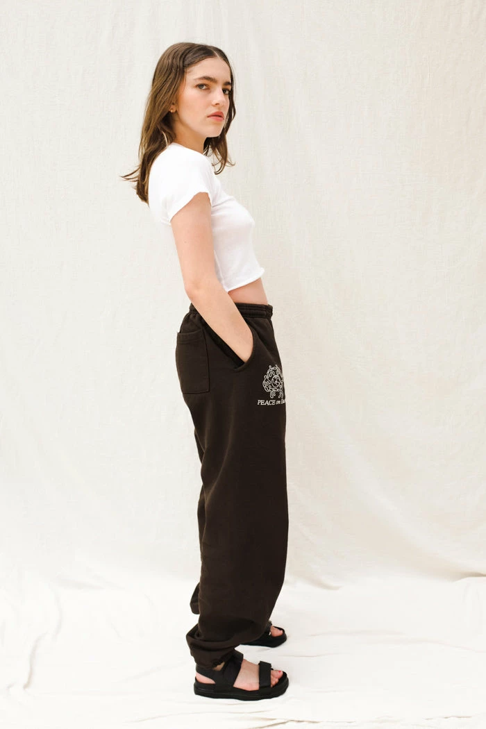 Palo Santo Studio unisex espresso brown peace people embroidered sweatpants. These sweatpants will wear in beautifully with age. They will expand and contract as you wear and wash, and there is an adjustable drawstring to tighten and loosen the waist.