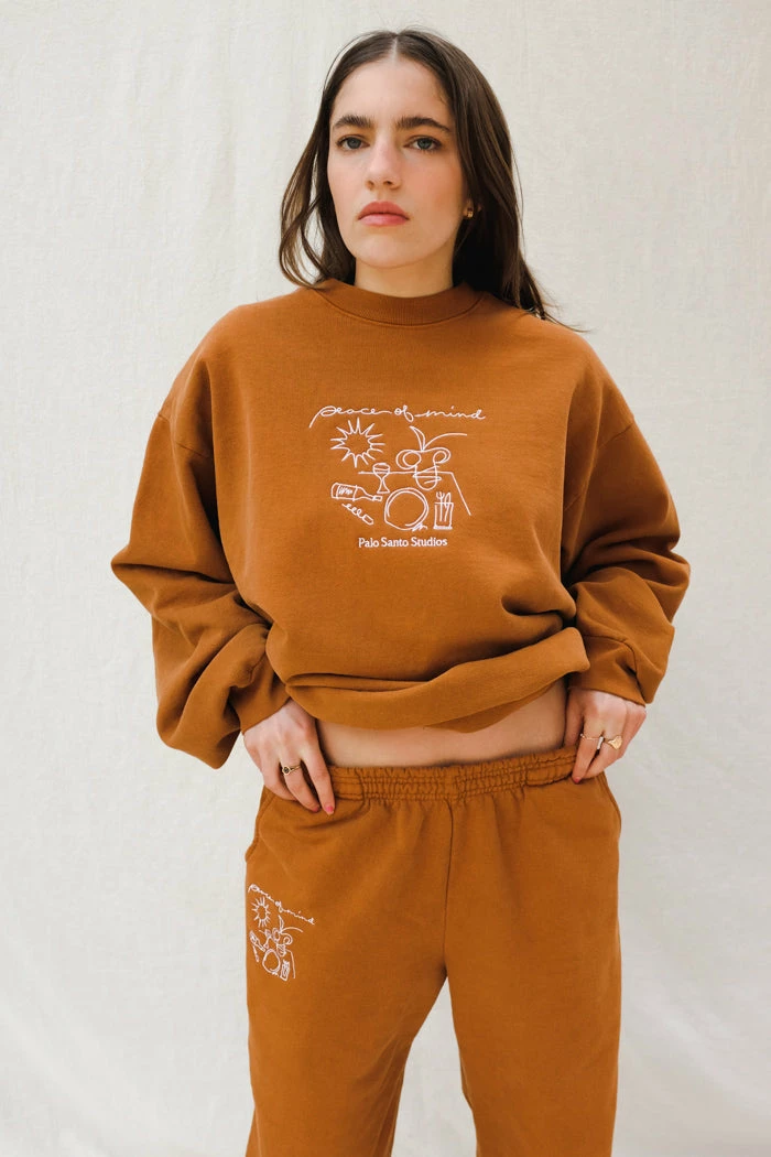 Palo Santo Studio Still Life Sweatshirt in terracotta. Oversized classic crewneck in a vintage-inspired garment wash.