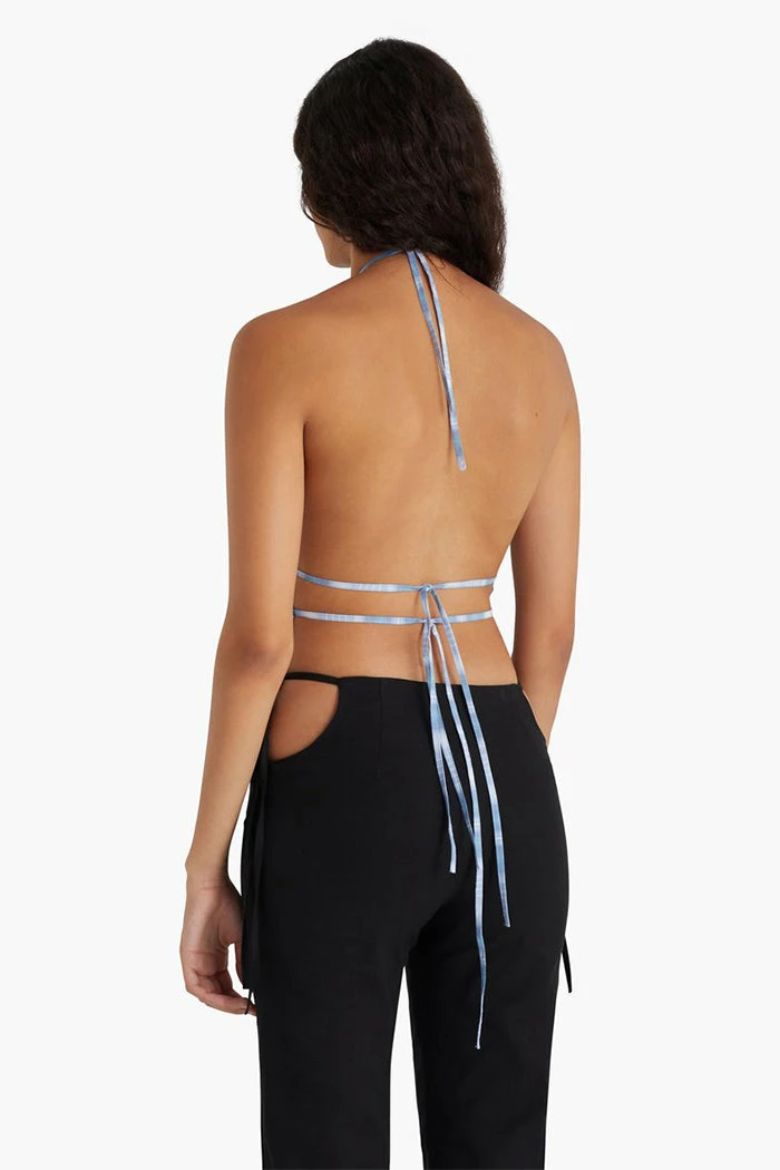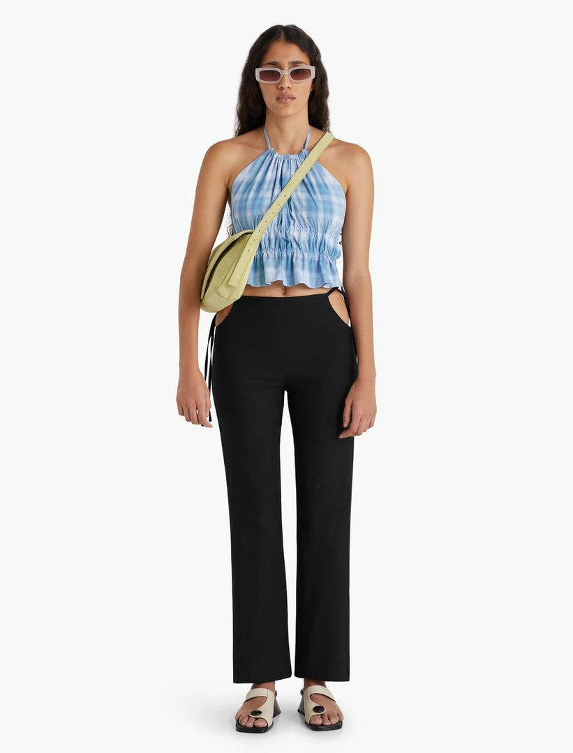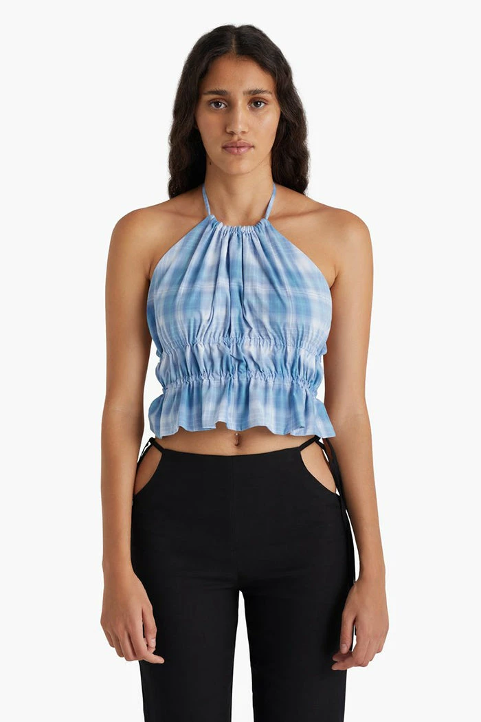 Paloma Wool Anouk halter top in blue plaid. Lightweight organic cotton top with adjustable strings around chest and neck.