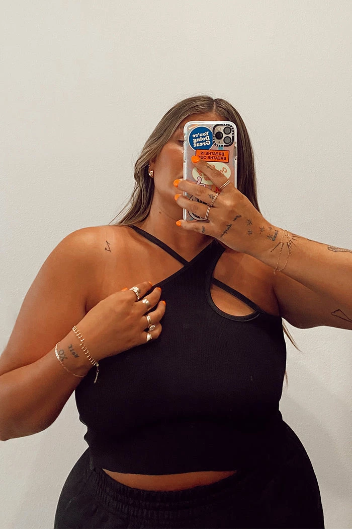 Cassie asymmetric criss cross ribbed knitted tank top in black.