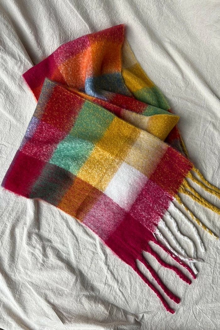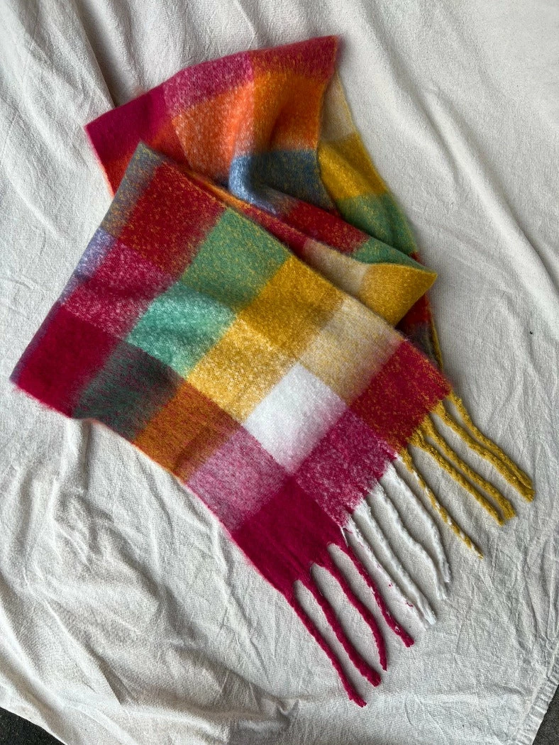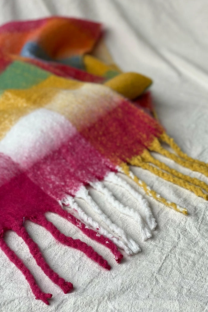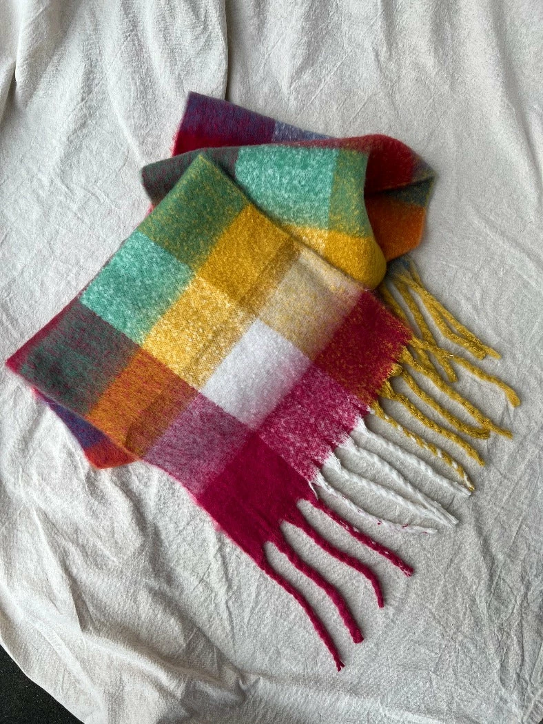 Super soft chunky yellow, orange red toned plaid colorful scarf.