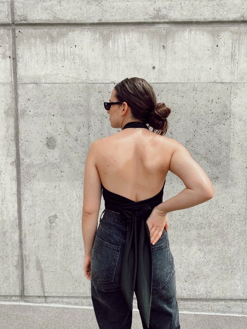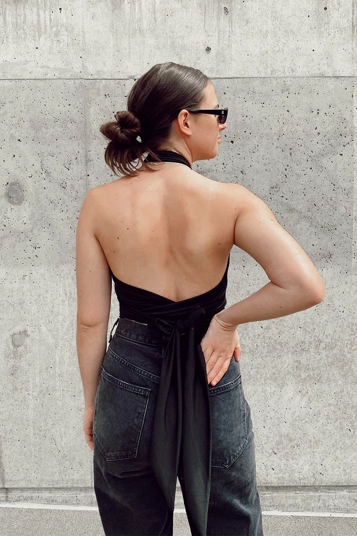 Monica wrap tank top in black. This tank top can be wrapped in an unlimited number of ways!