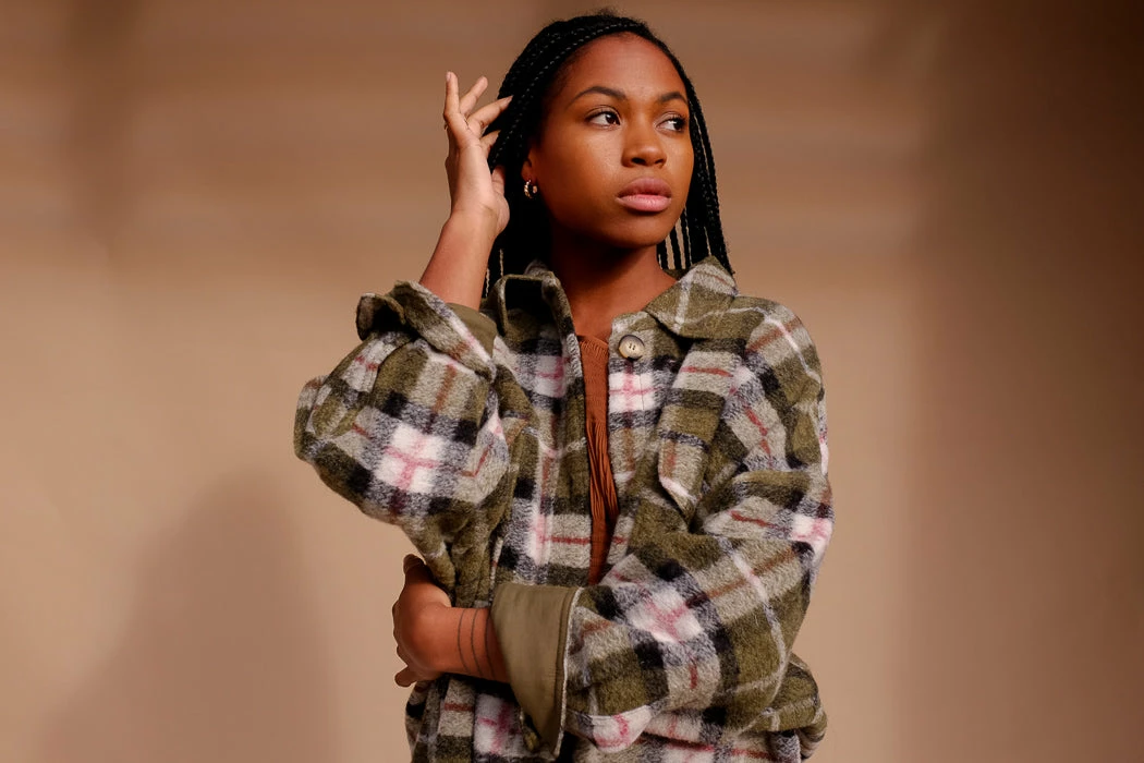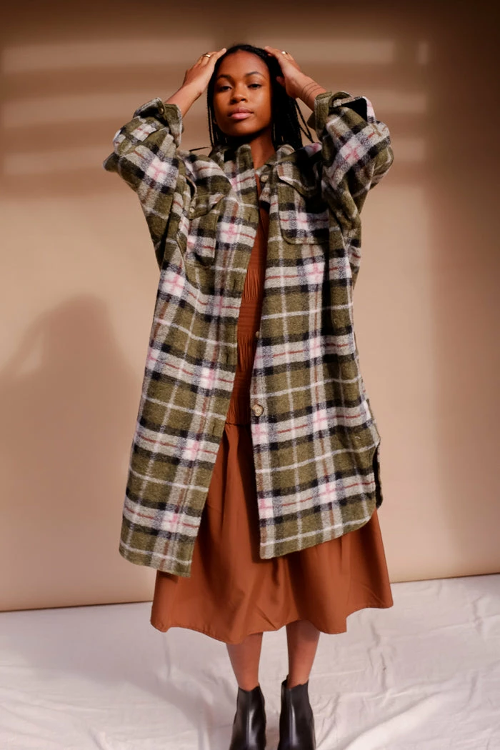 Blake plaid long button up jacket in green plaid. Its your favorite wool flannel in coat form.
