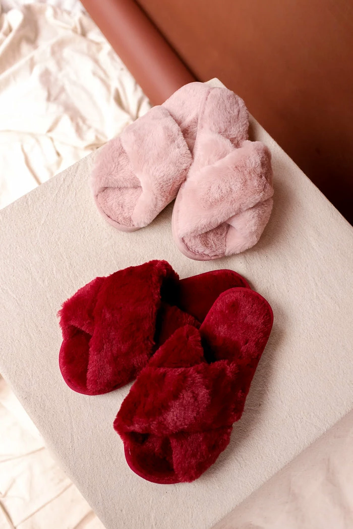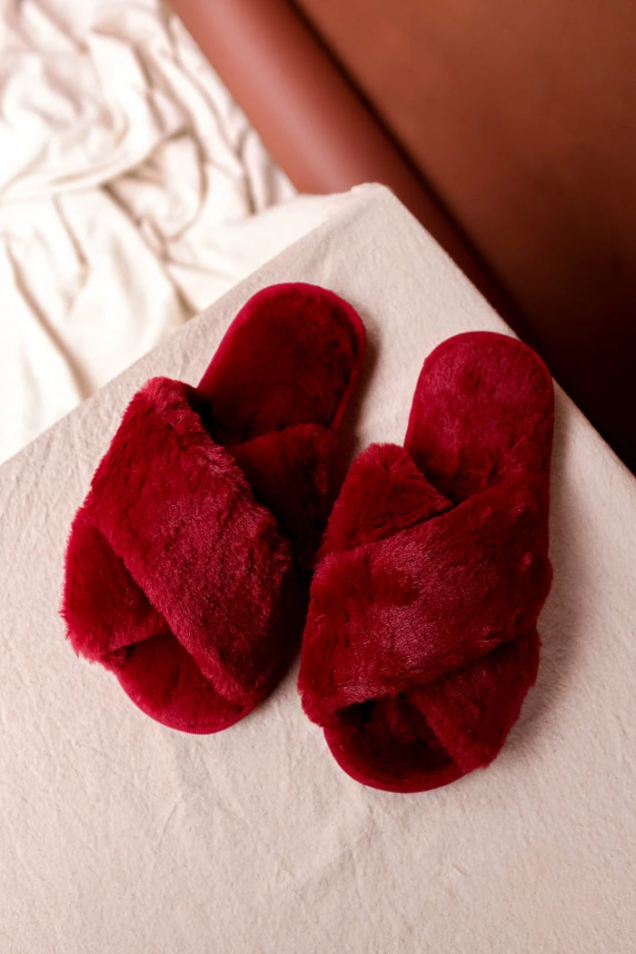 Fuzzy red crimson, criss-cross, cozy, open toe slippers with rubber sole.