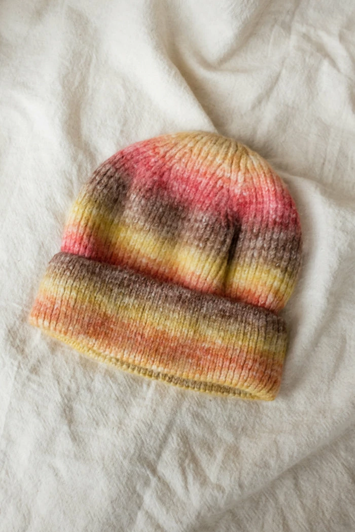 Soft knit red peach, yellow, tan ombre Sunset beanie.