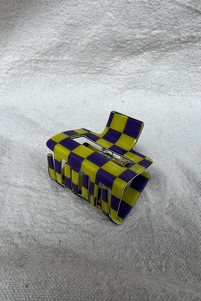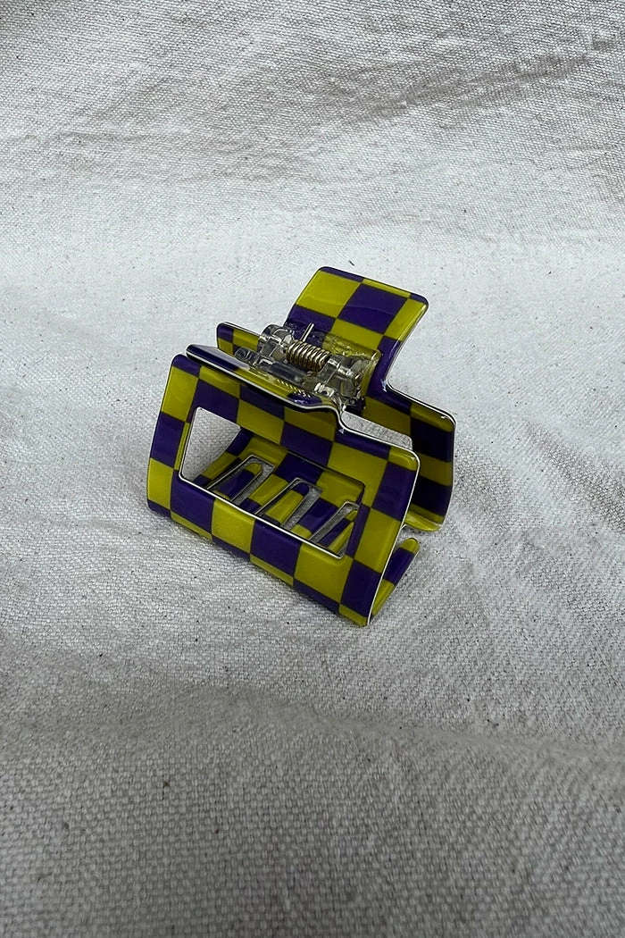 Small square hair claw in yellow and purple checker.