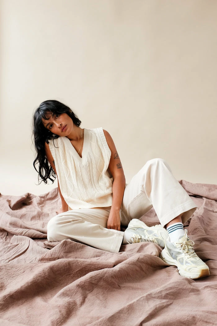 Victoria cream cable knit sweater vest.