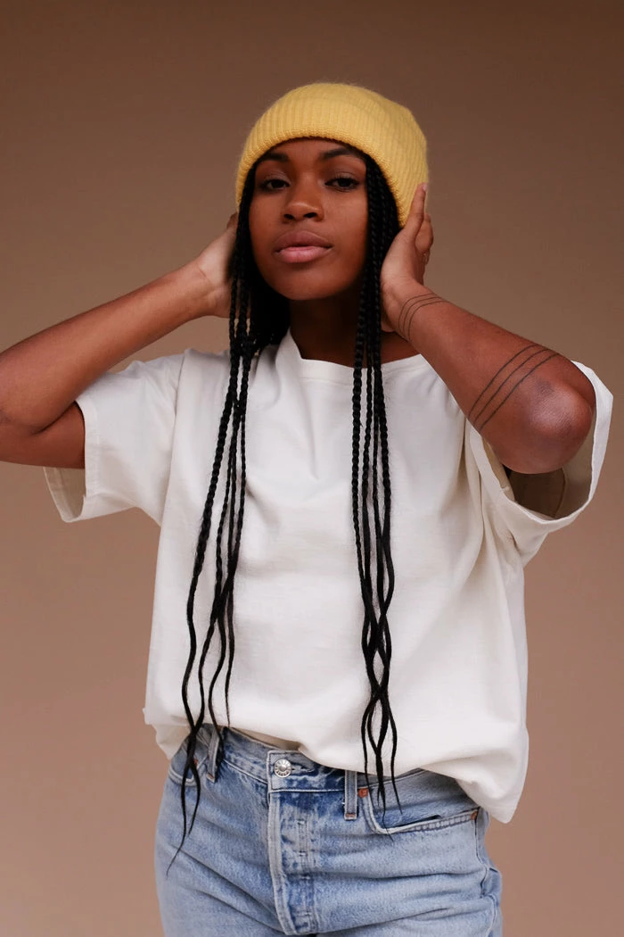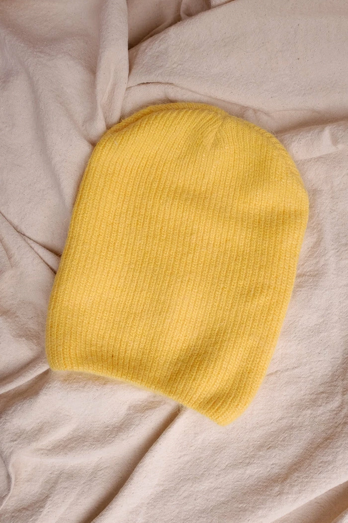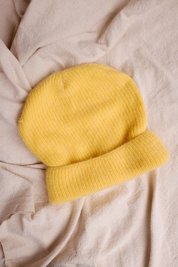 Smith knit yellow beanie is the perfect fuzzy beanie for the winter.