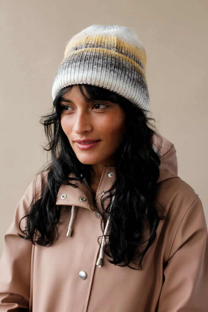 Soft knit mustard, white, tan ombre Sunset beanie.