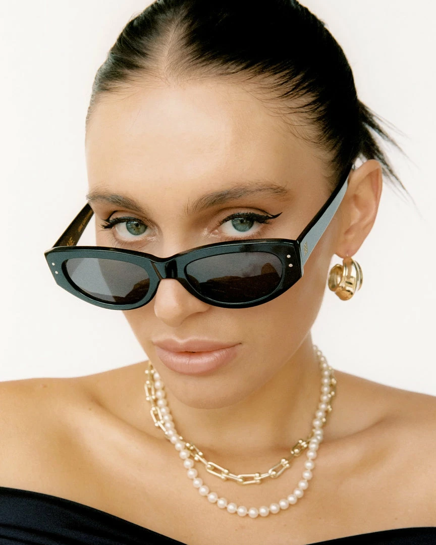 Raie Lakota Sunglasses in black. The unisex oval frame is one of the most modern and durable frames, each pair has signature metal detailing outside the lenses, making him your go to for the street.