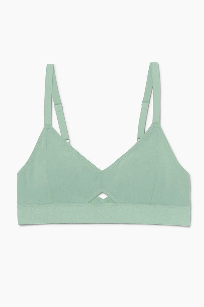 Richer Poorer cut out center bralette in sage green. Modest coverage. Pullover style with wide elastic band. Ultra-soft modal cotton blend. Shrink resistant. Adjustable & convertible straps.