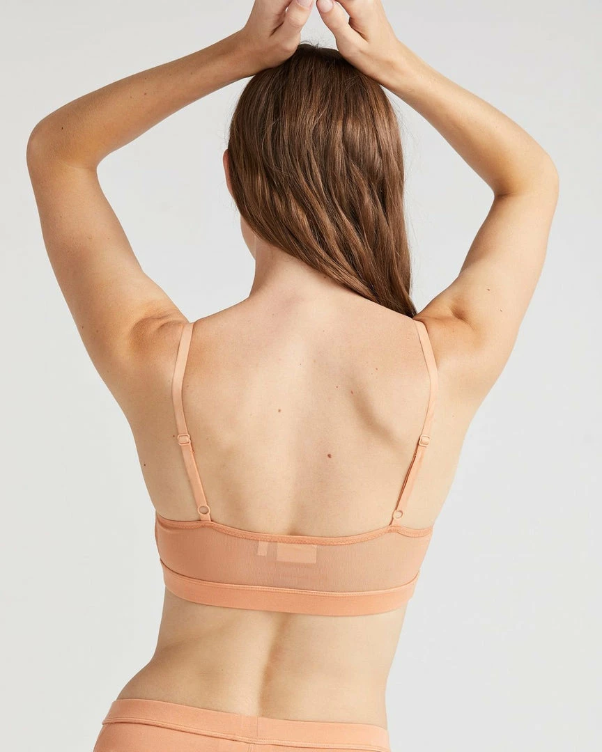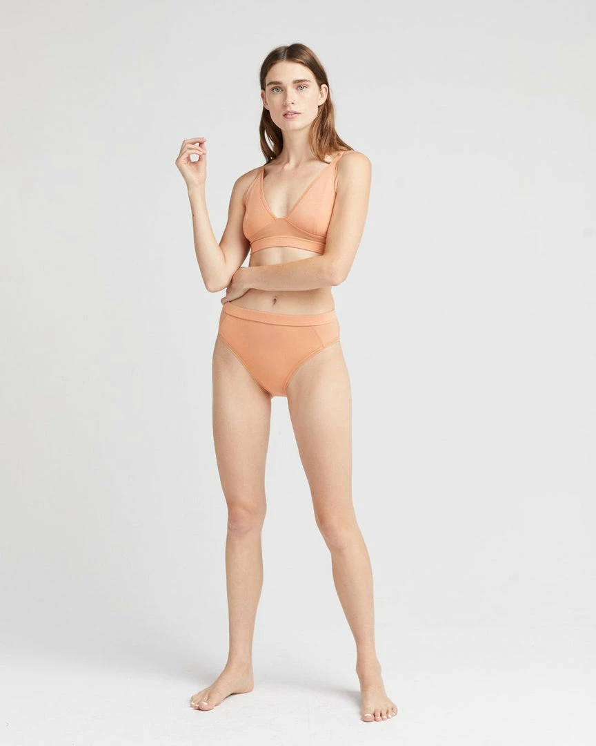 Richer Poorer high cut bralette in clay orange. Modest coverage, pullover style with covered elastic band, separate high apex cups, power mesh detail and adjustable straps.