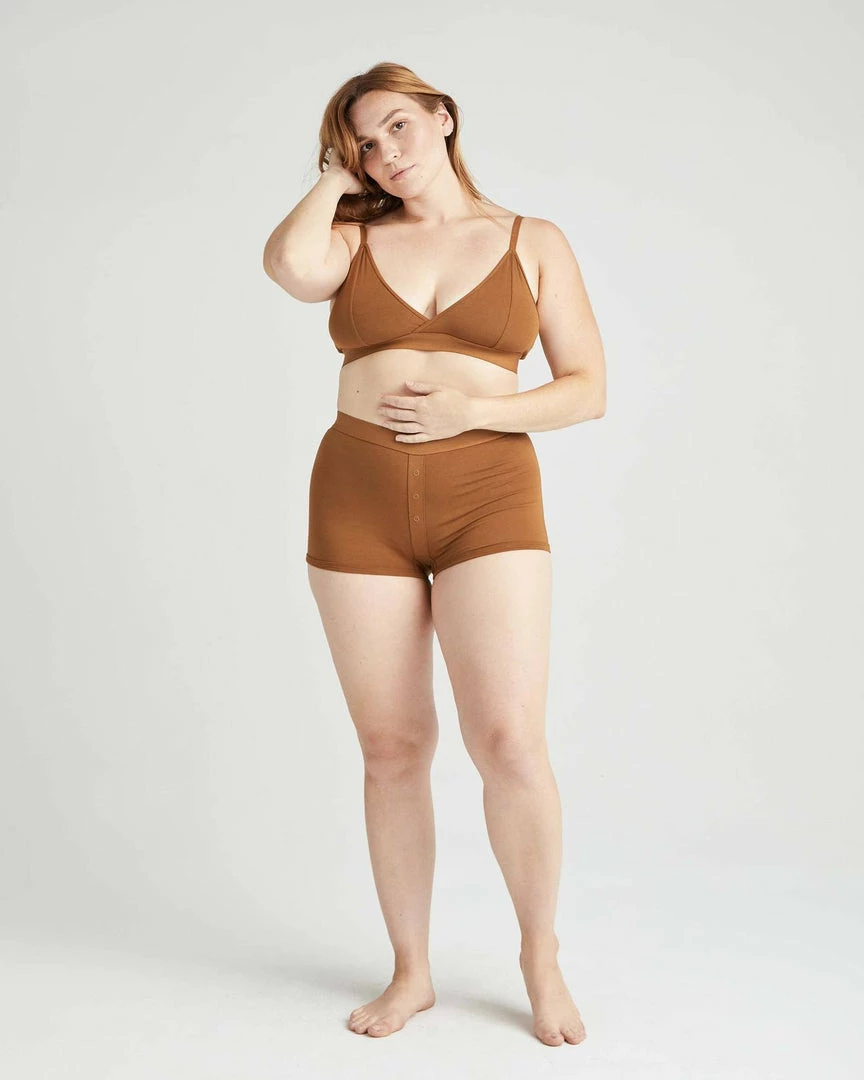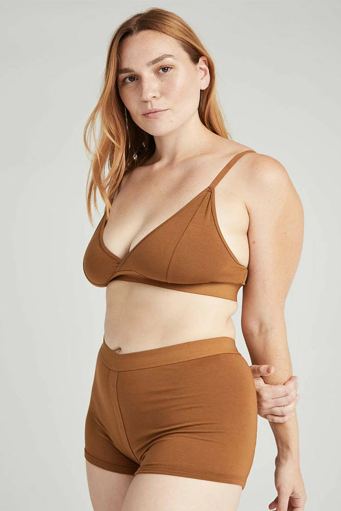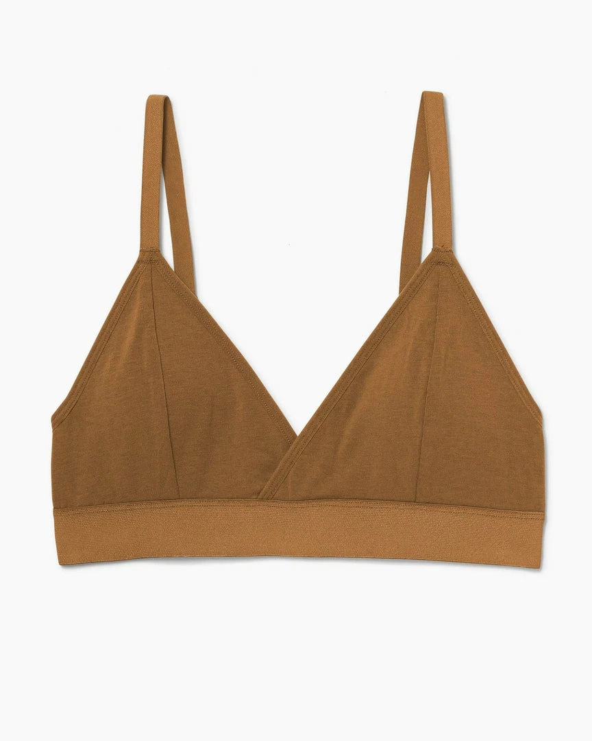 Richer Poorer classic bralette in woodgrain. Minimal coverage, pullover style with wide elastic band.. Separate Triangle cups, with darts, unpadded and unstructured. Ultra-soft modal cotton blend. Shrink resistant. Adjustable straps.