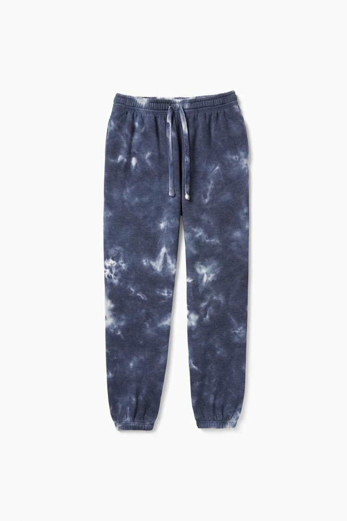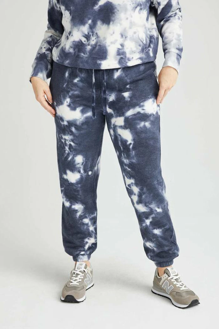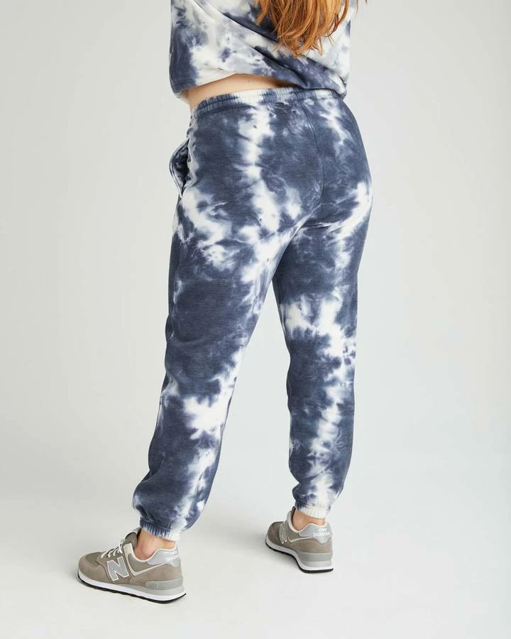 Richer Poorer blue storm tie dye wash, recycled fleece, jogger style sweatpants in super soft—but thick, broken in fabric. Classic fit, encased elastic waist and leg openings, silicone softened for broken-in feel, side seam pockets.