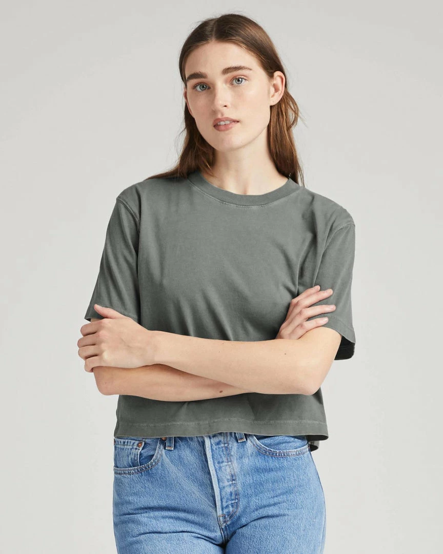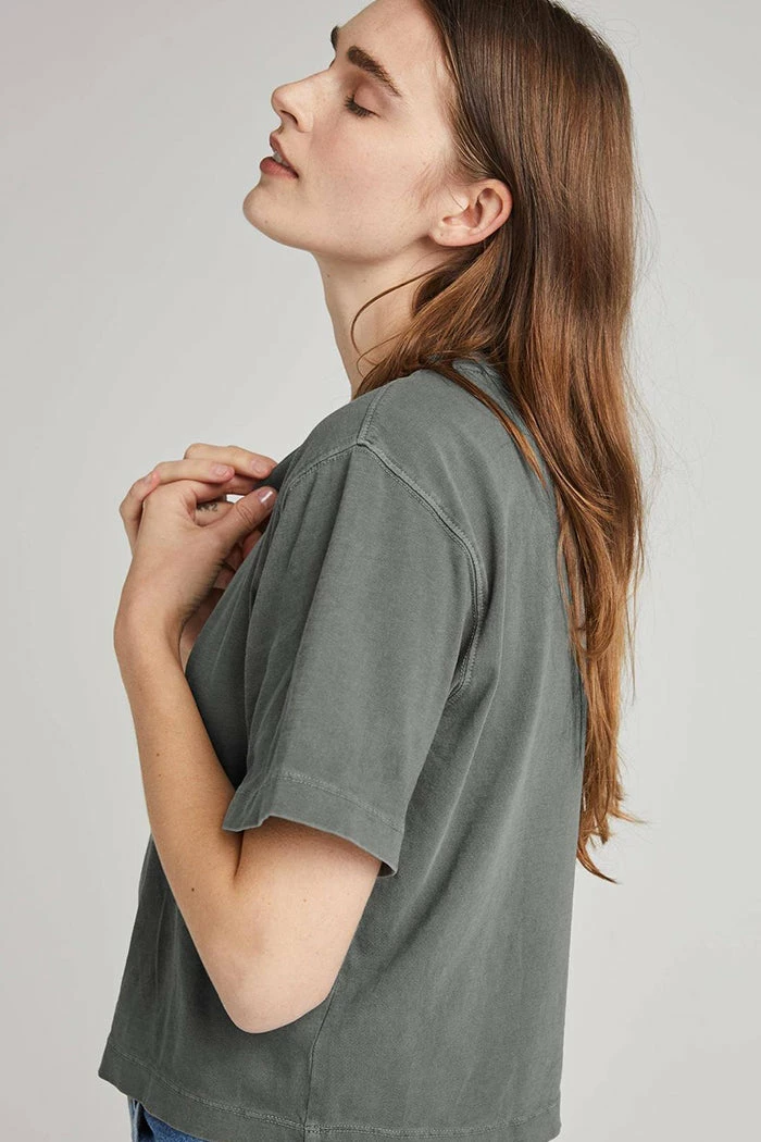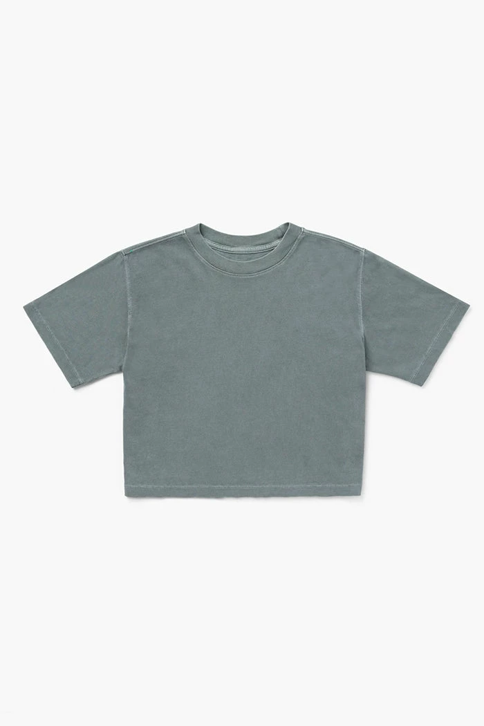 Richer Poorer gunmetal relaxed short sleeve crop tee in amazing semi thick cotton. Pigment dyed, dropped shoulder seams. Oversized neck rib.