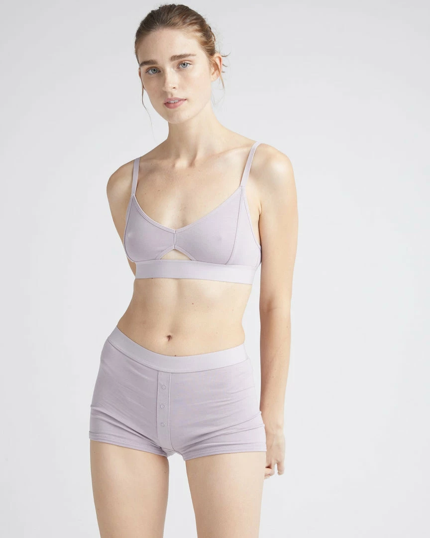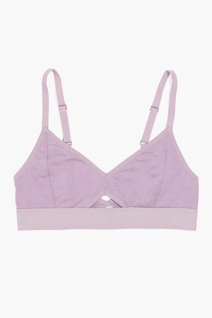 Richer Poorer cut out center bralette in purple amethyst smoke. Modest coverage. Pullover style with wide elastic band. Ultra-soft modal cotton blend. Shrink resistant. Adjustable & convertible straps.