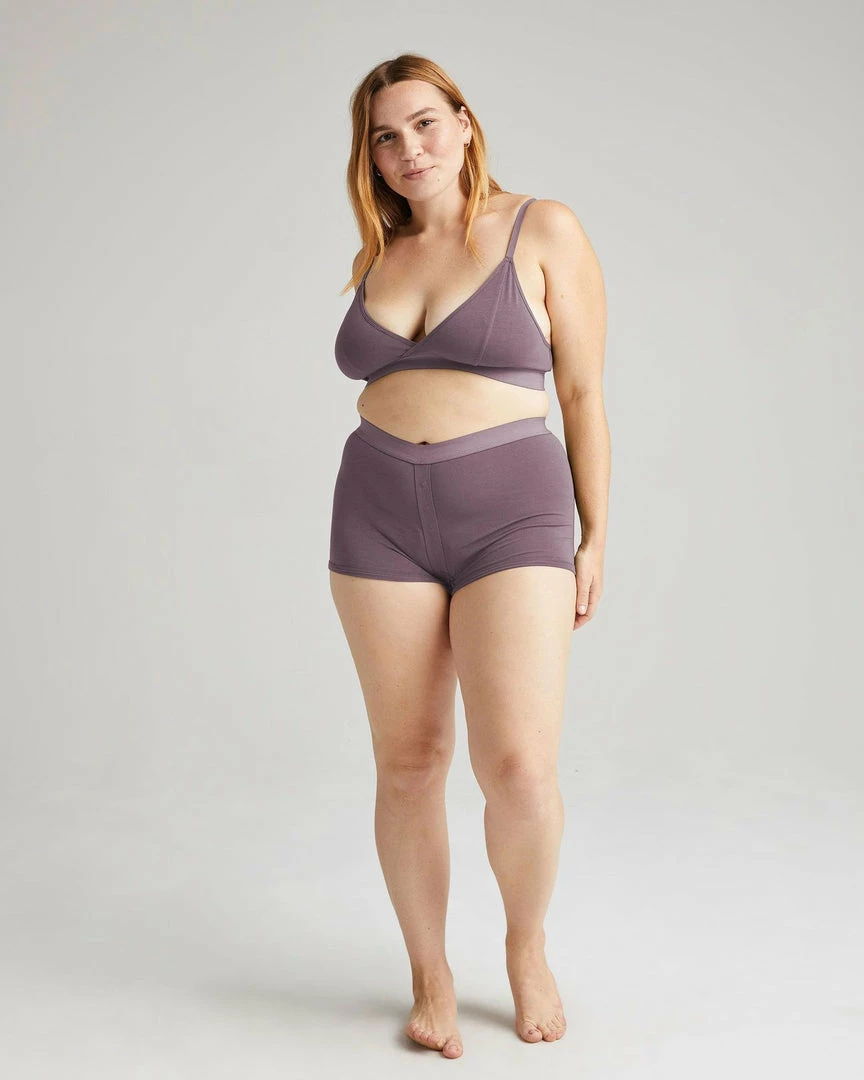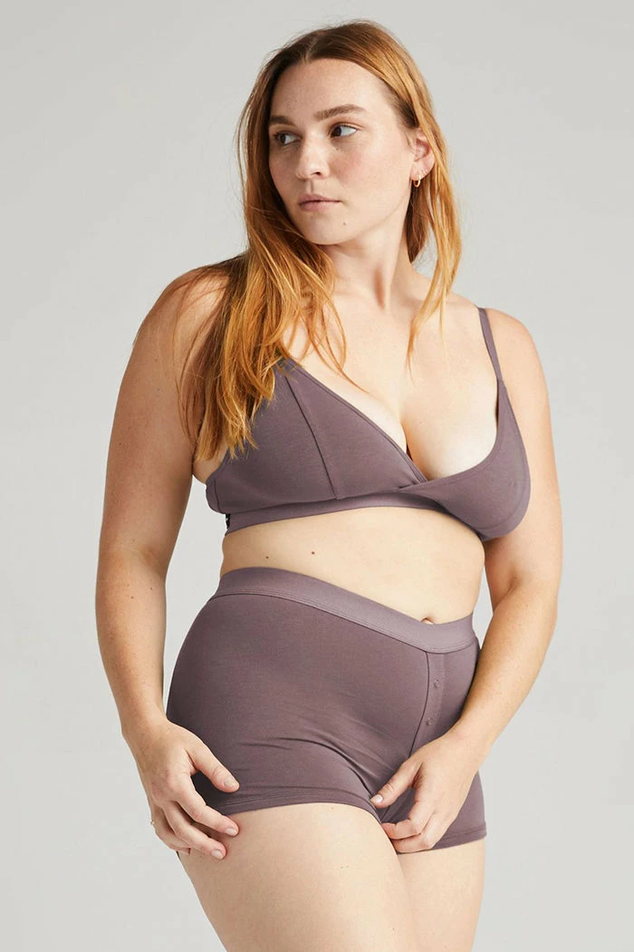 Richer Poorer plum smoke boxer briefs. Soft elastic waistband, faux snap detail at front, ultra-soft modal cotton blend, shrink resistant.