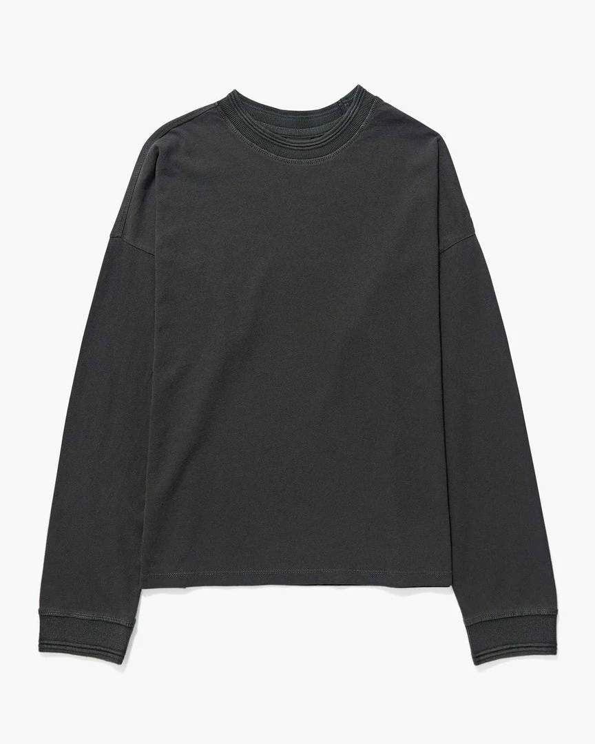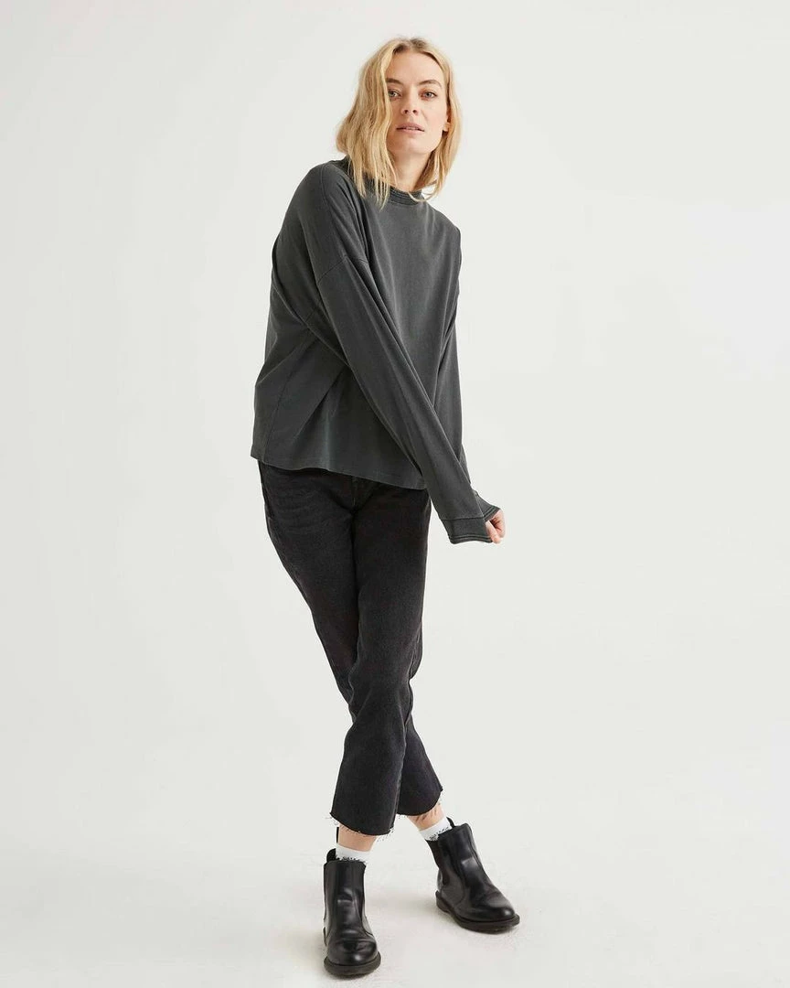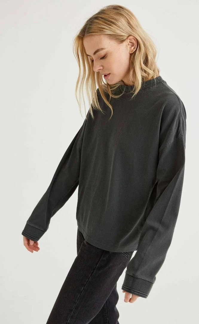 Richer Poorer relaxed thick long sleeve pullover. Pigment dyed, dropped shoulder seam, novelty sweater rib detail and novelty stitching detail.