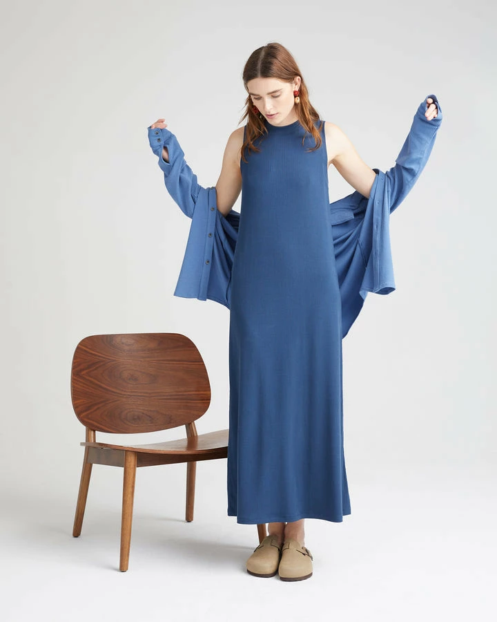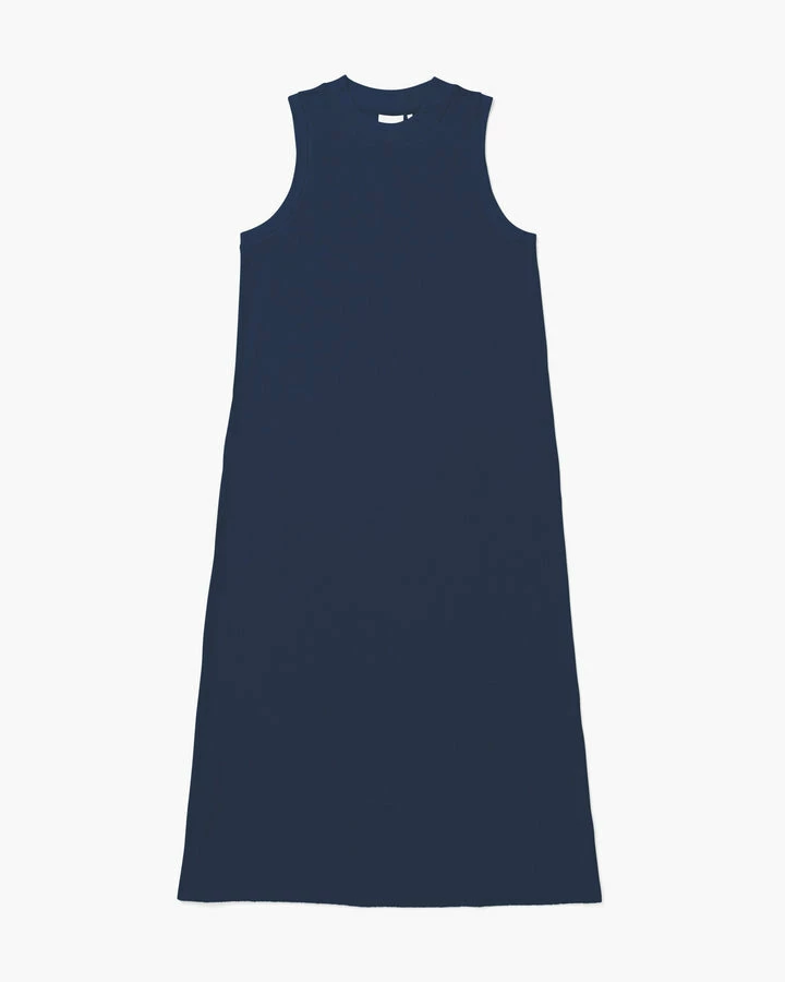 - Richer Poorer vintage column rib maxi dress in moonlit ocean. High neckline, dropped armhole, wide rib trim, ankle length.Â