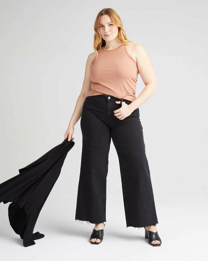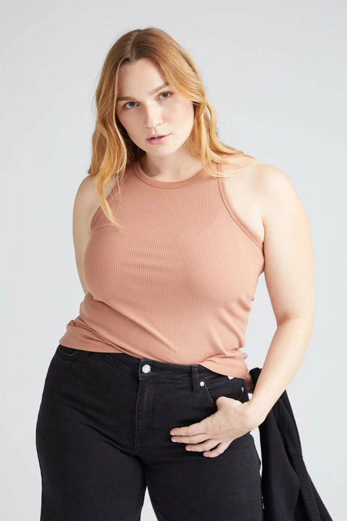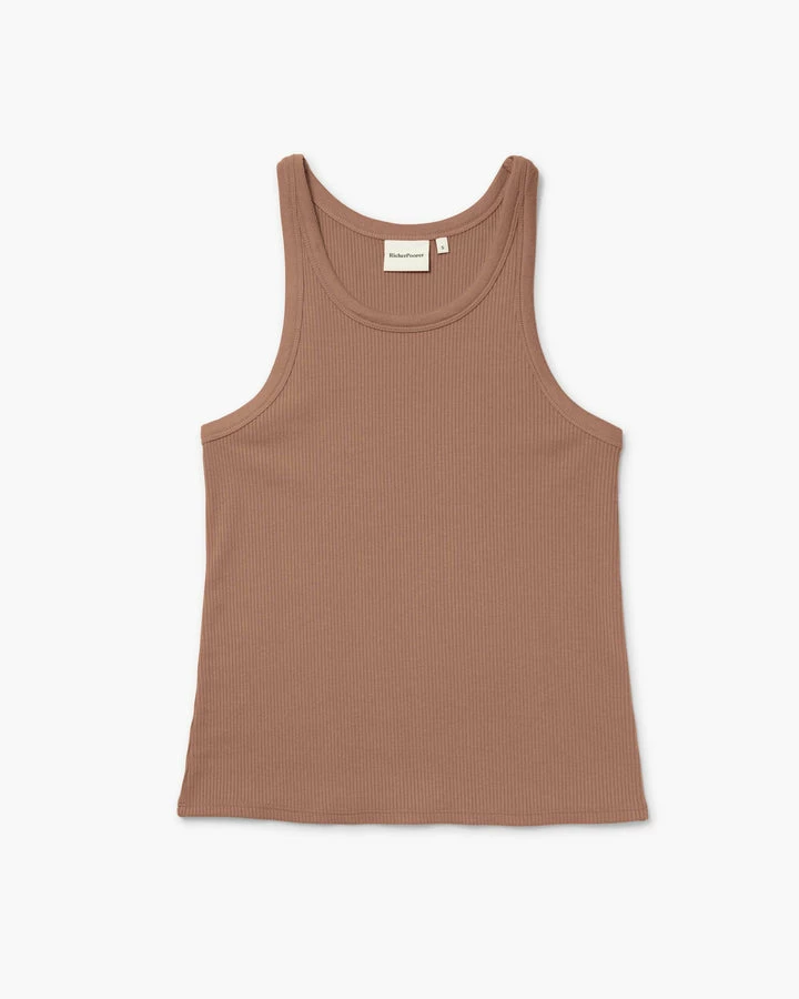 Richer Poorer vintage rib knit racer tank in mocha mousse. Slim fit, made from sustainable lyocell, high neckline with slight racer front shape.Â