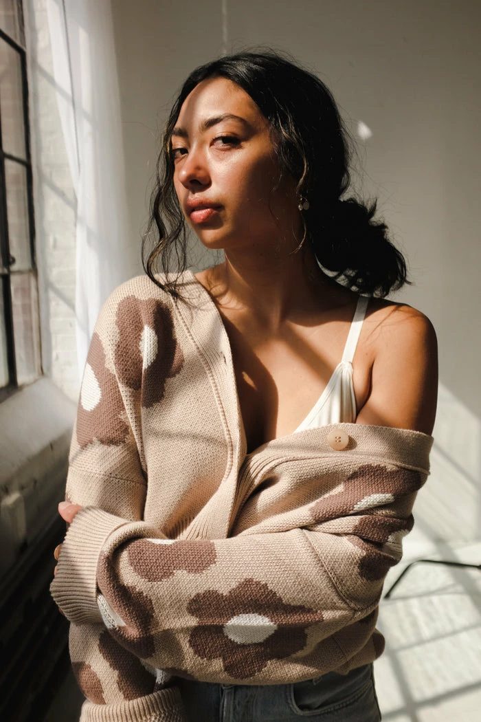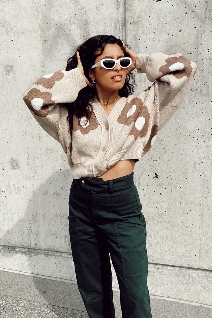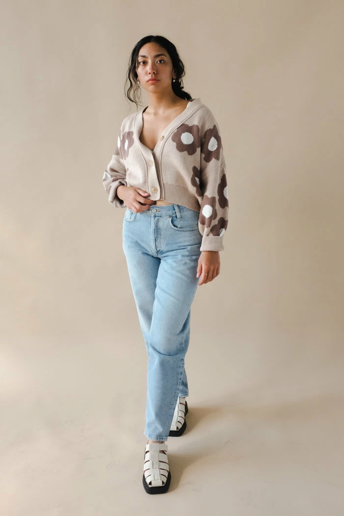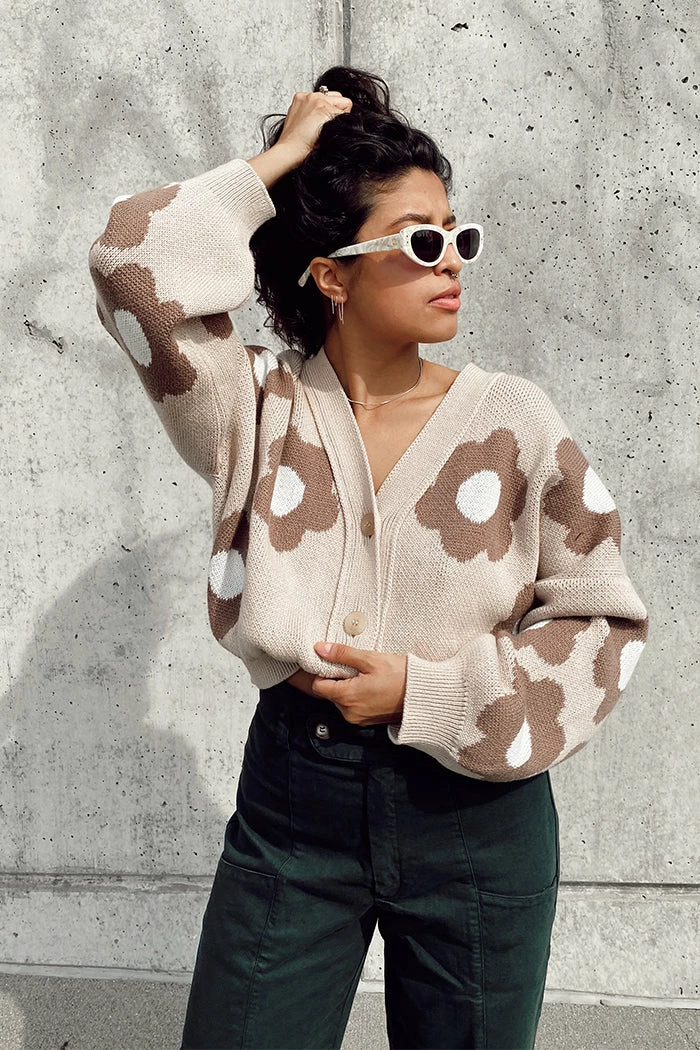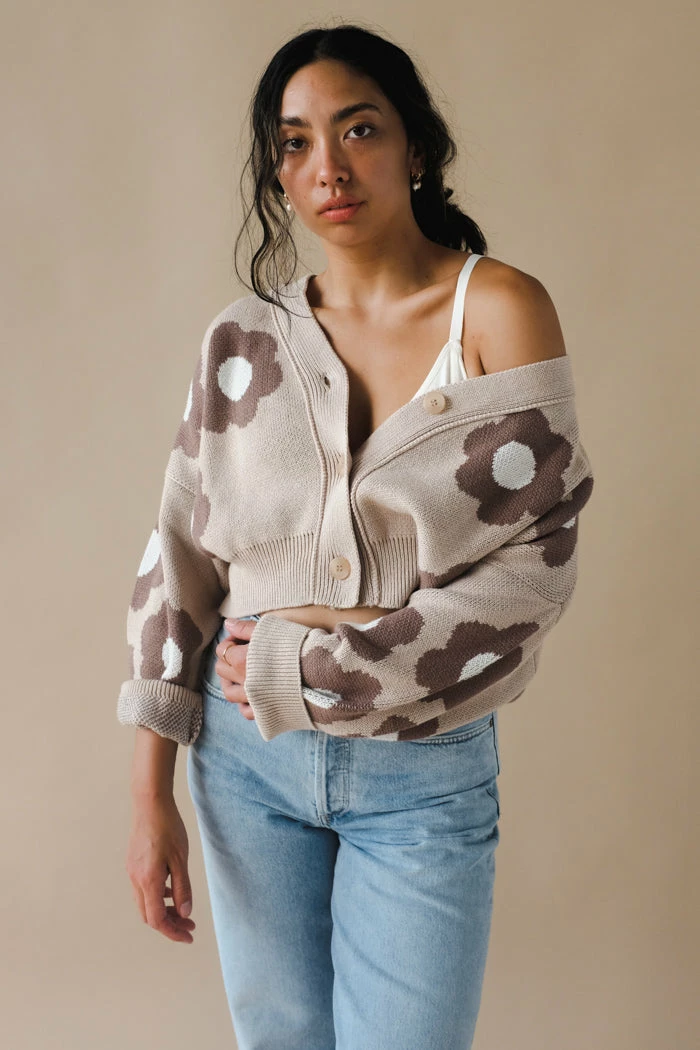 Rita Row beige floral cropped oversized Cork cardigan.