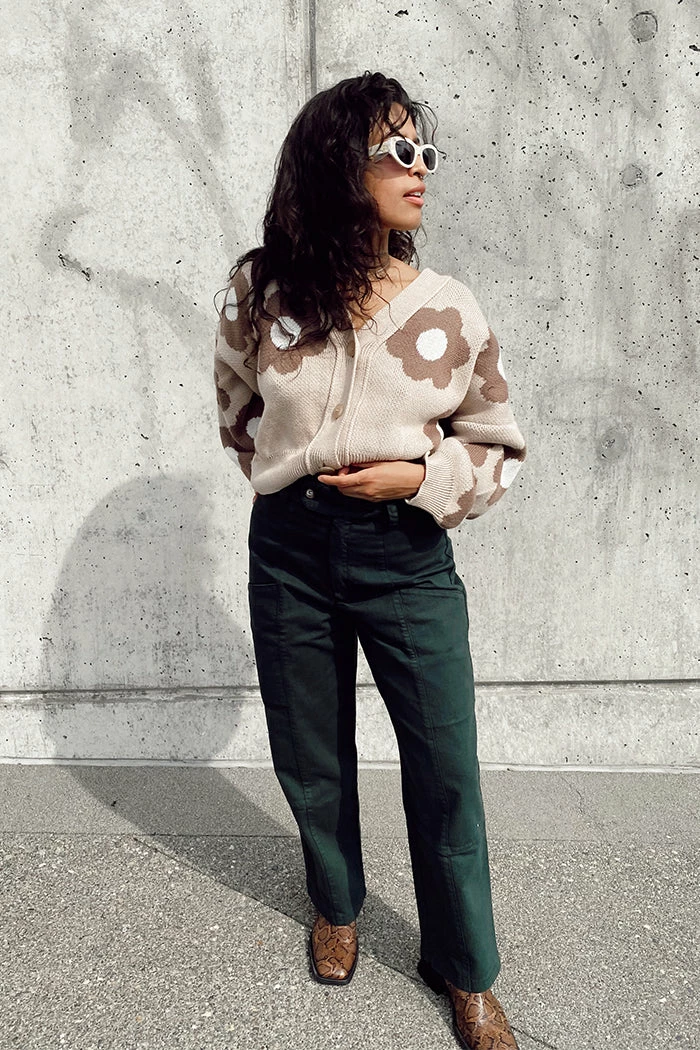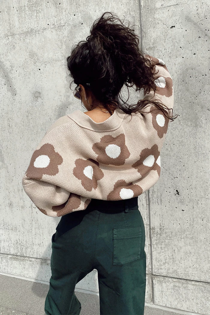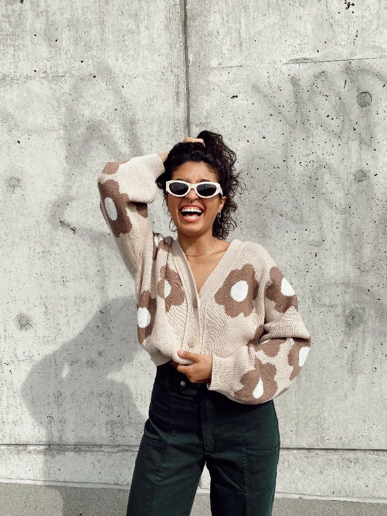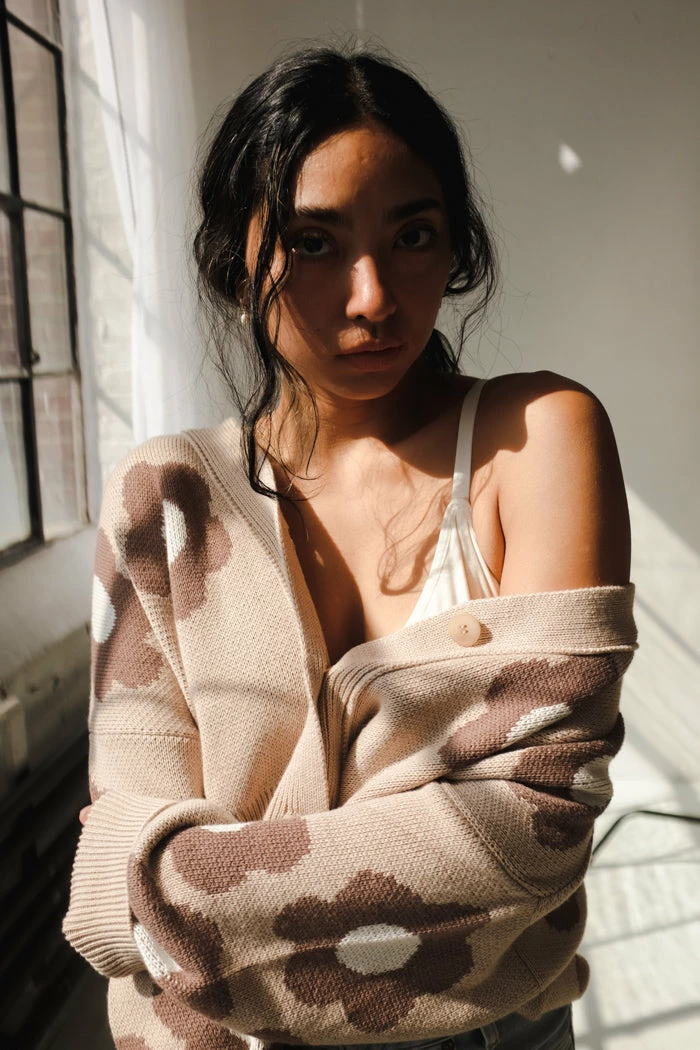 Rita Row beige floral cropped oversized Cork cardigan.