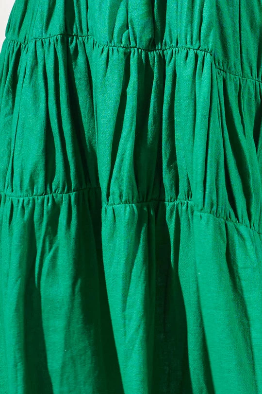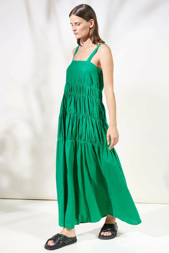 Rue Stiic Elsa linen maxi dress in french green. Featuring adjustable straps, a square neckline and a loose fitting body, finished with layered gathering details.