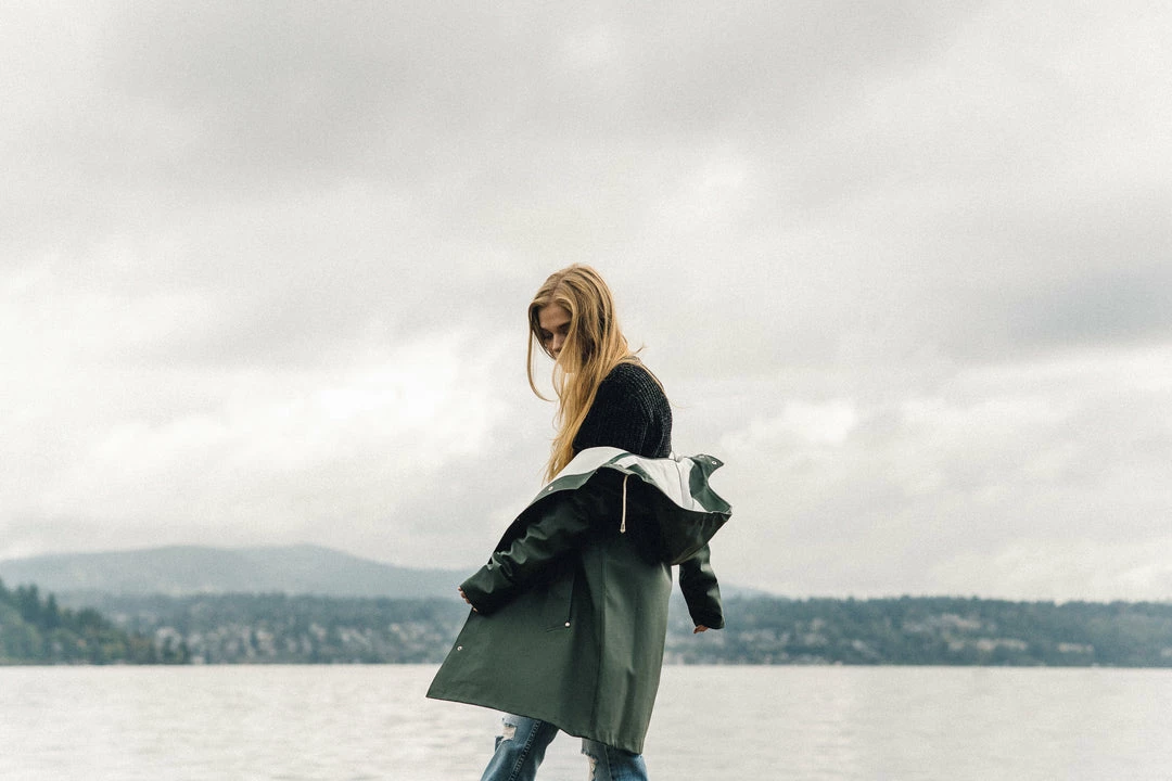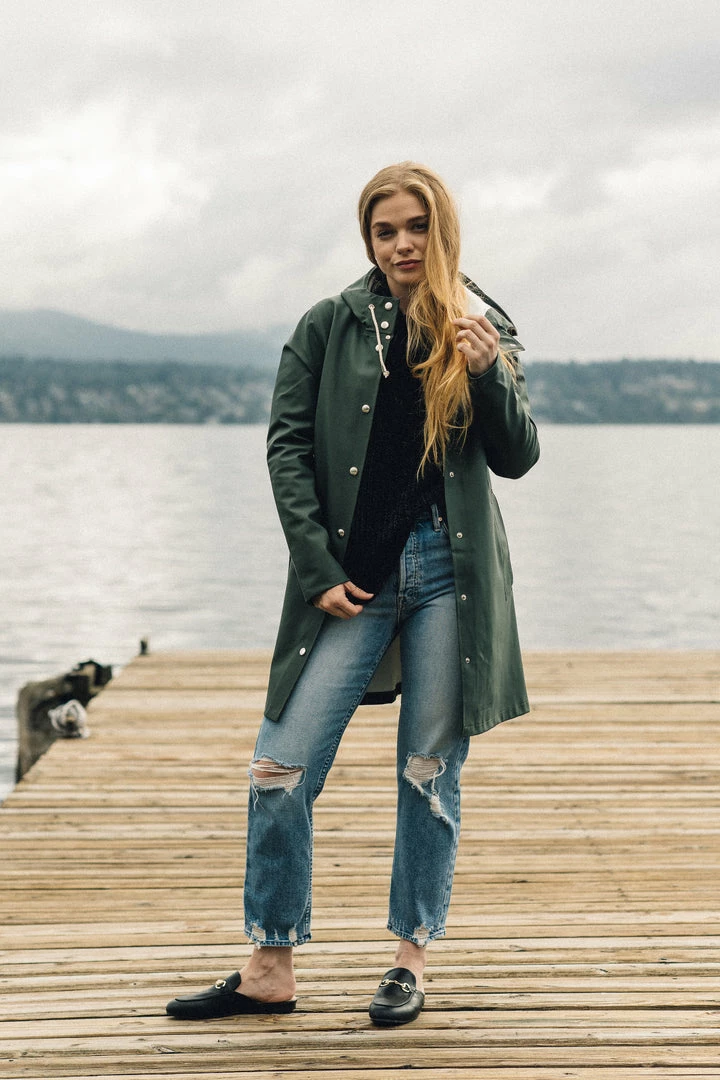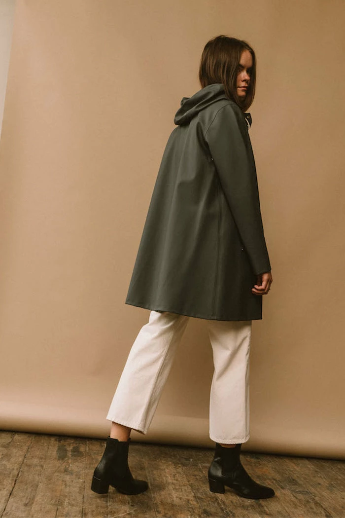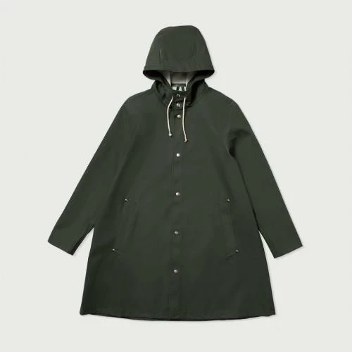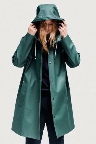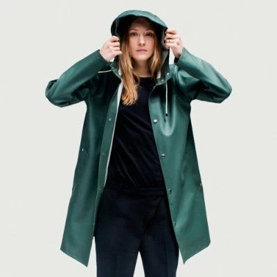 Stutterheim Mosebacke green raincoat is the A-line version of Stutterheim’s iconic raincoat. This unisex model has a fashion forward silhouette, with a spacious cut. It is handmade in rubberized cotton, comes unlined and with welded seams. The finest craftsmanship is used to create this beautiful raincoat, here in green with silver buttons and hemp strings. See other colors in the Mosebacke here!Check out the straight Stockholm style here. Mosebacke