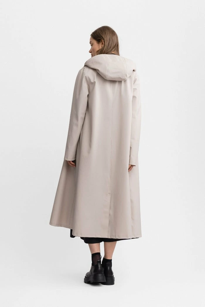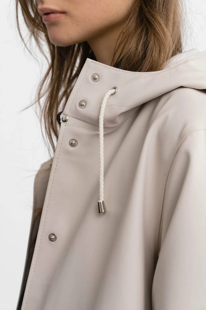 Stutterheim Mosebacke long raincoat in light sand is the a flowing A-line women’s raincoat combining flair with all-weather protection in a slightly long cut. Mosebacke is the ladies’ specific complement to our unisex Stockholm raincoat. It combines the best of Stutterheim’s Scandinavian design sensibilities and wet-weather protection with a flowing, feminine silhouette. It is handmade in rubberized cotton, comes unlined and with welded seams. The finest craftsmanship is used to create this beautiful raincoat, here in light sand with silver buttons, white cotton lining and hemp strings. See other colors in the Mosebacke here! Check out the straight Stockholm style here. Mosebacke