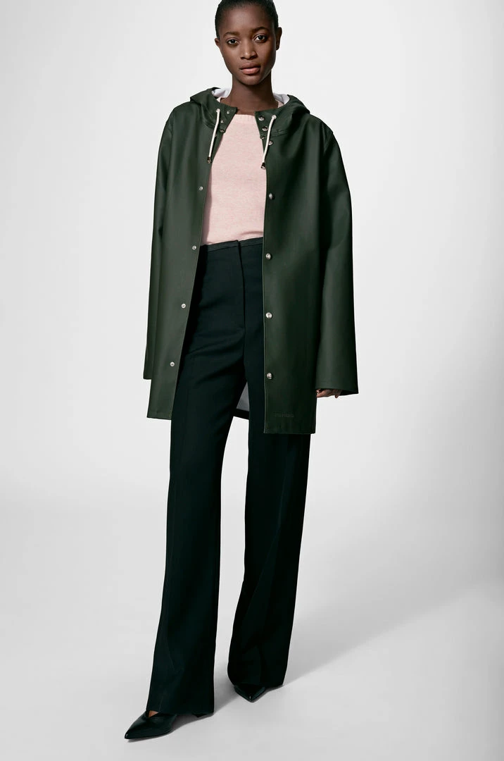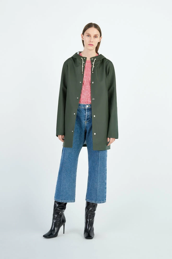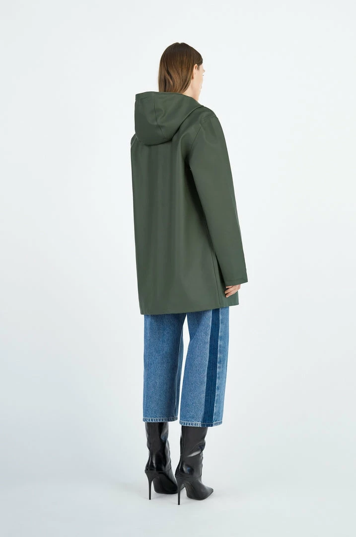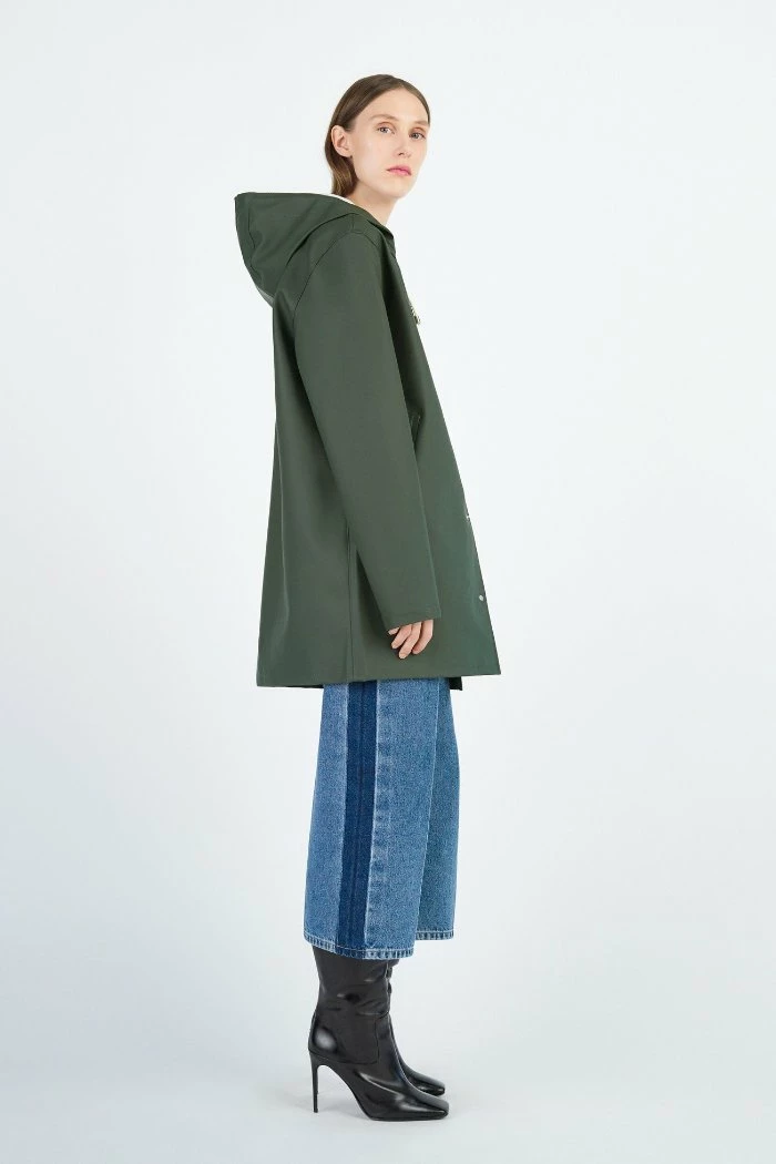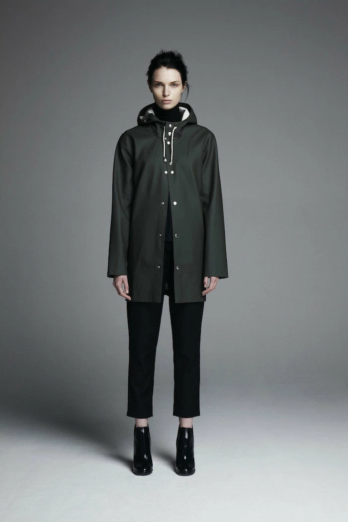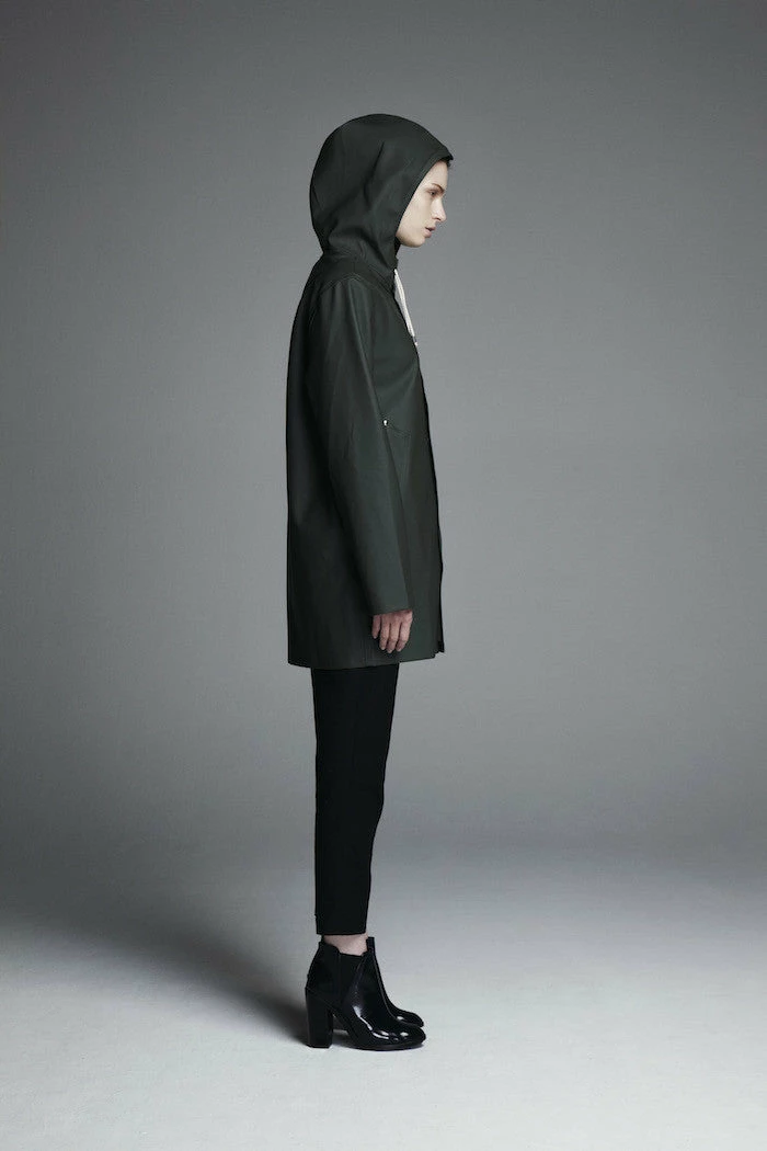 STUTTERHEIM Stockholm rain jacket in classic Green has snap closure, drawstrings, and exemplifies both versatility and durability in its updated design. Using the finest craftsmanship materials and details, the Stockholm coat has undergone sever testing in horrible conditions both at sea and in the city. Each coat is individually quality-controlled and handmade by a skilled seamstress. 100% waterproof. See other colors in Stockholm style here, or check out the A-line Mosebacke style here.