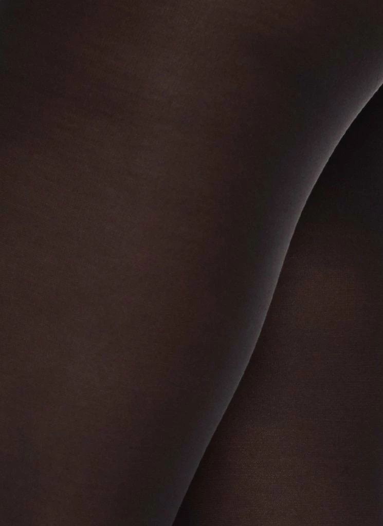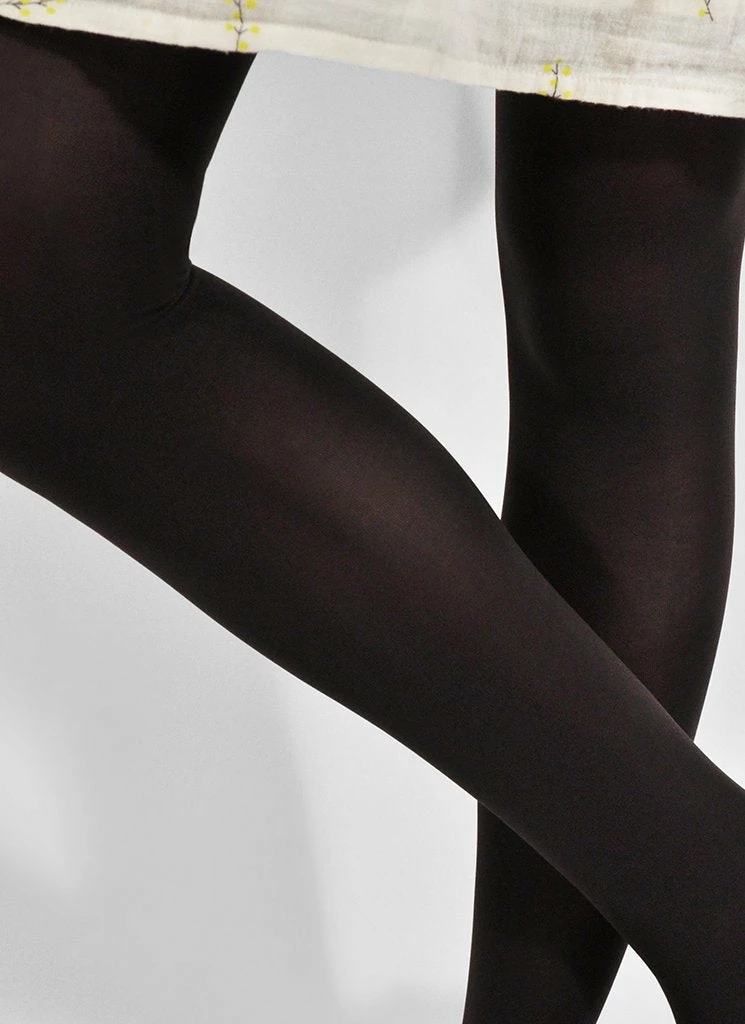 Olivia premium tights in black by Swedish Stockings. These 60 denier matte pantyhose are a true classic. Knitted with recycled, premium yarn these tights have a wide and high waistband that won’t slip or sag.Â