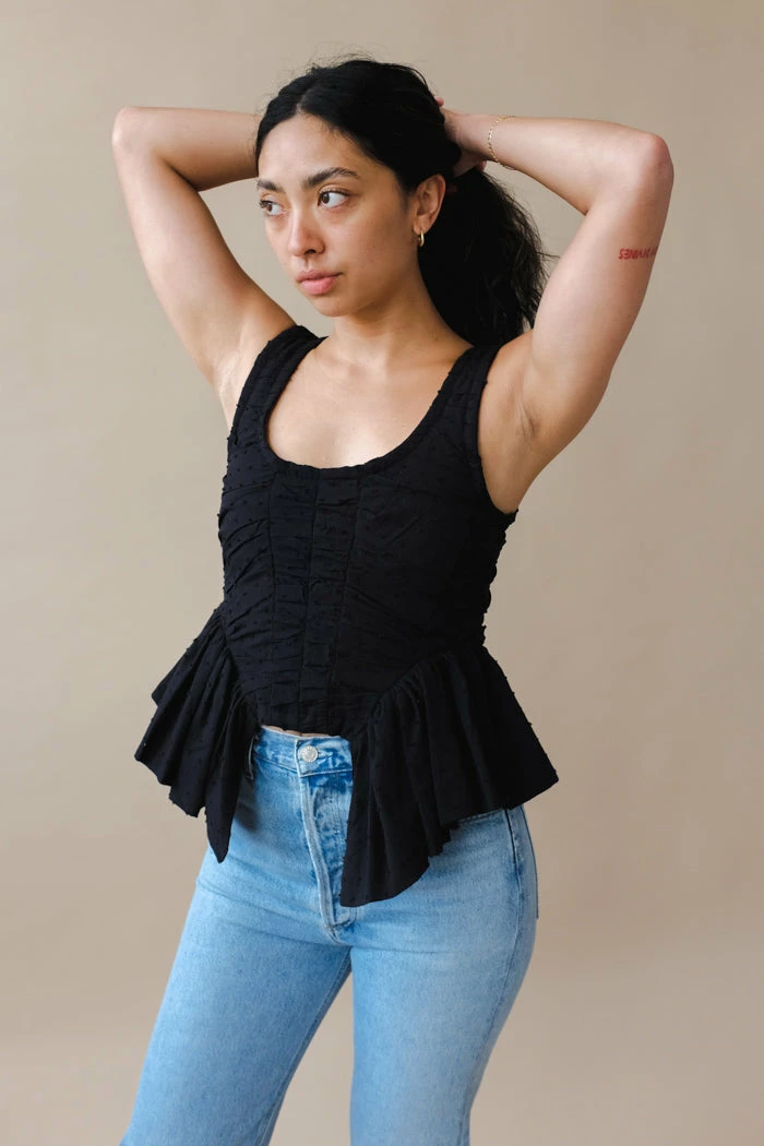 Tach Carmina textured voile drapped black corset top. Zipper at the back.