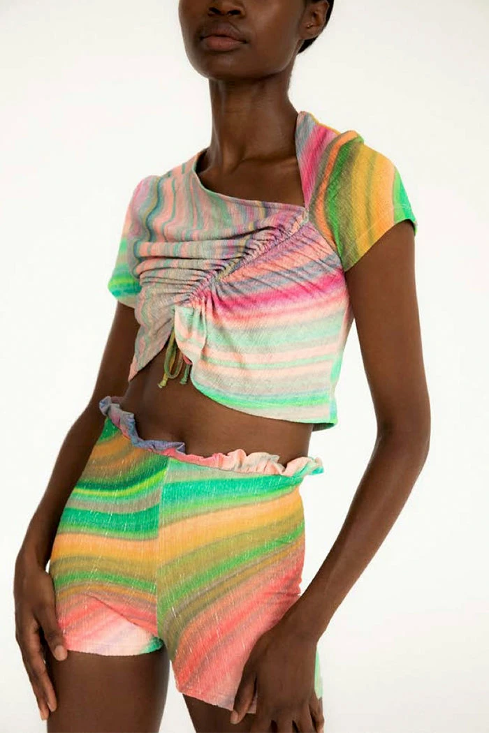 Tach Clarissa multi colored, textured, printed, adjustable top. Irregular neckline, drapped at the front. Short sleeves. Fabric is stretchy.