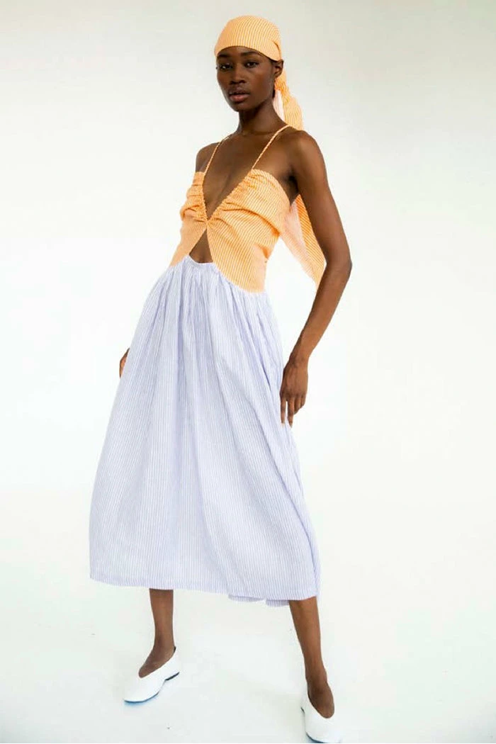 Tach Sandine stripped, color blocked, strappy, linen maxi dress.