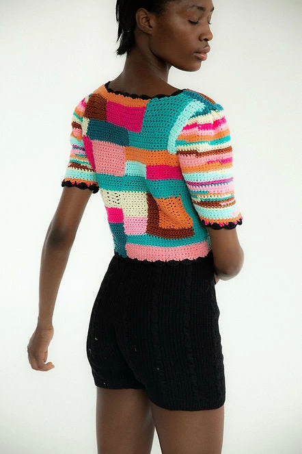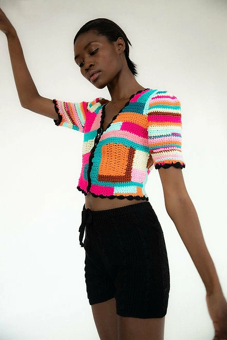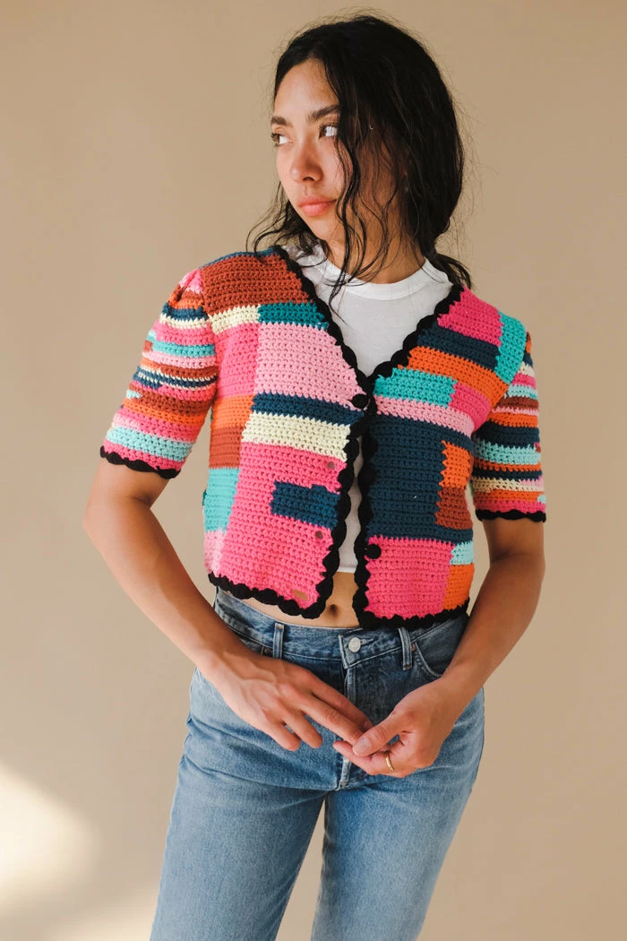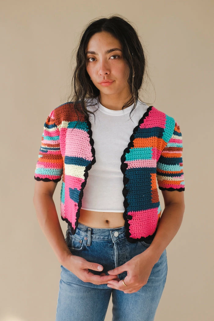 Tach crochet knit multicolor short sleeve cardigan. Handmade crochet trim finished.