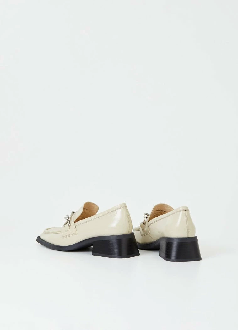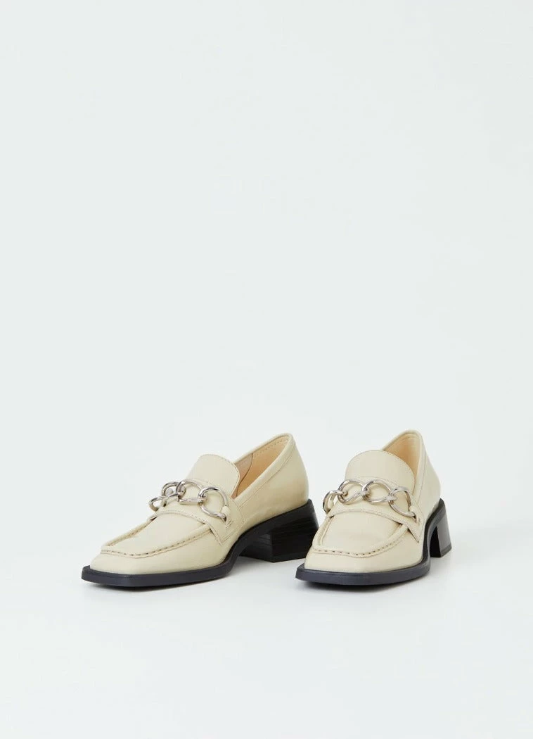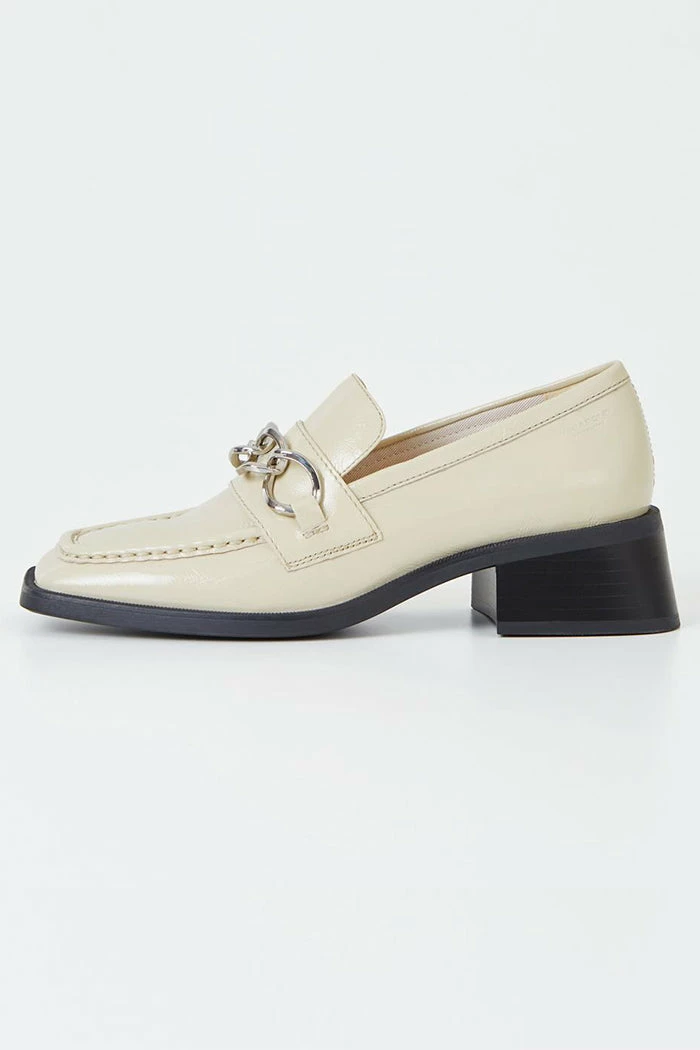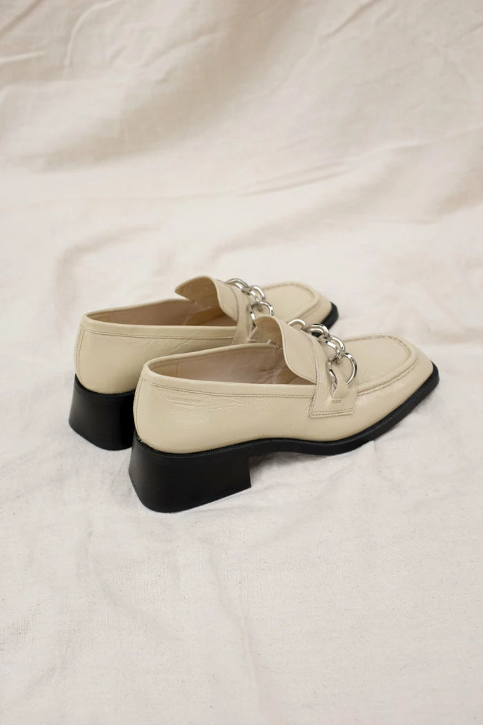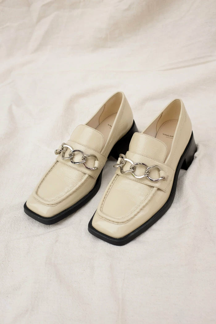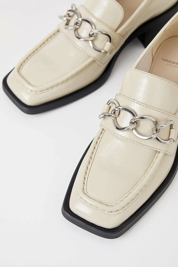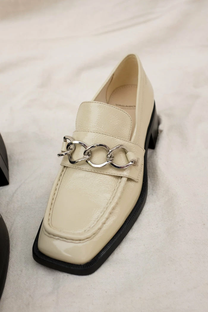 Vagabond Blanca patent plaster square toed loafers, with chunky silver chain detail.Â