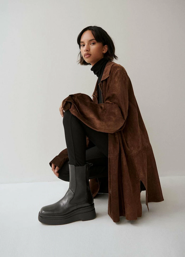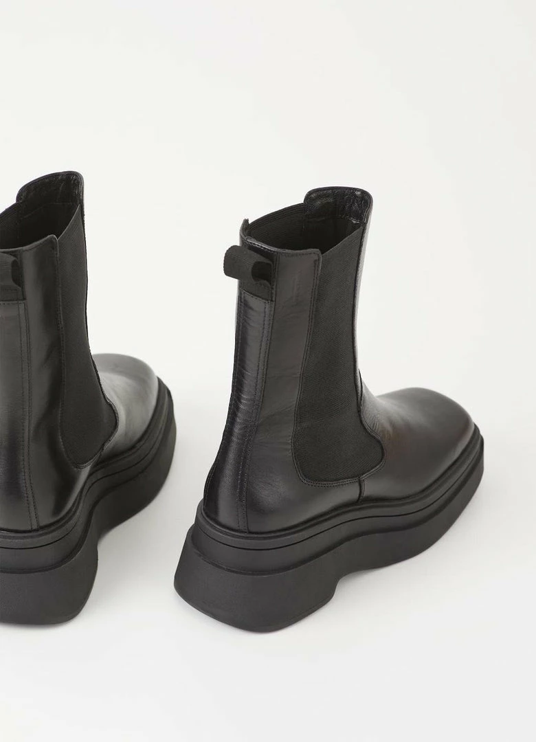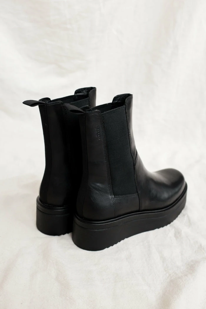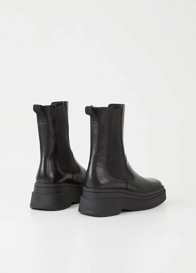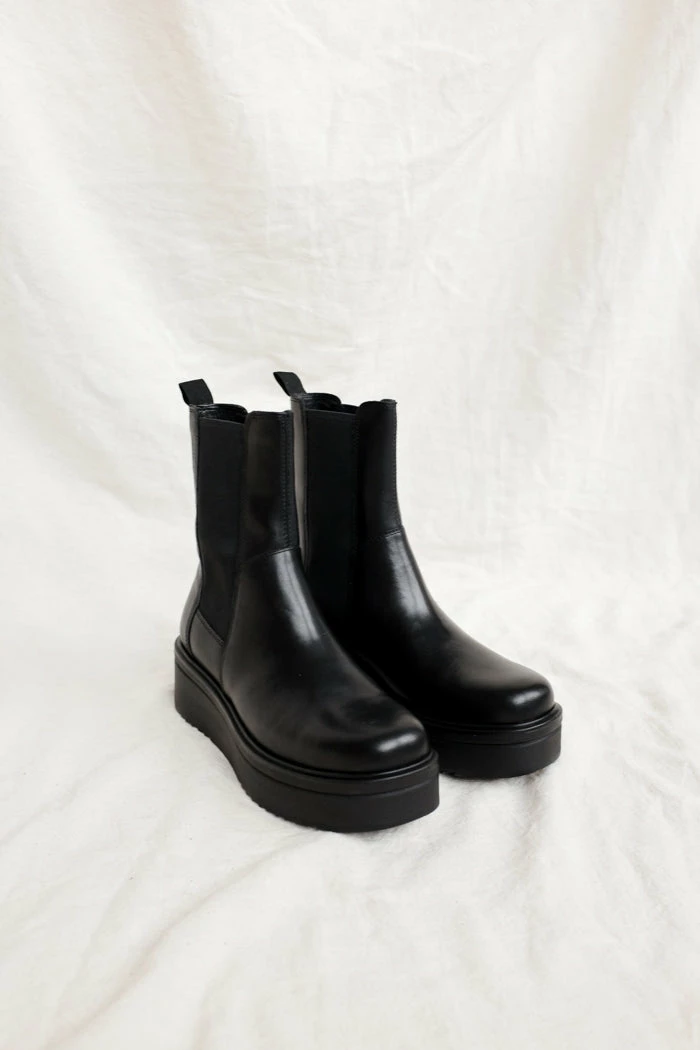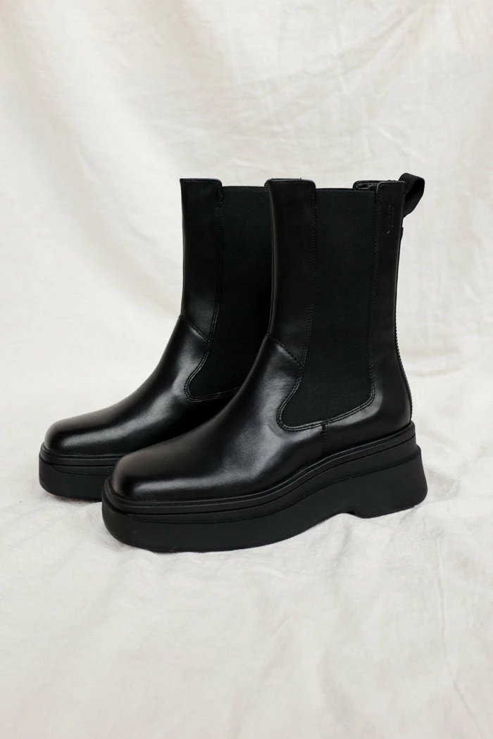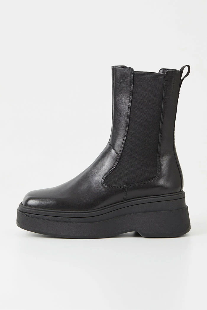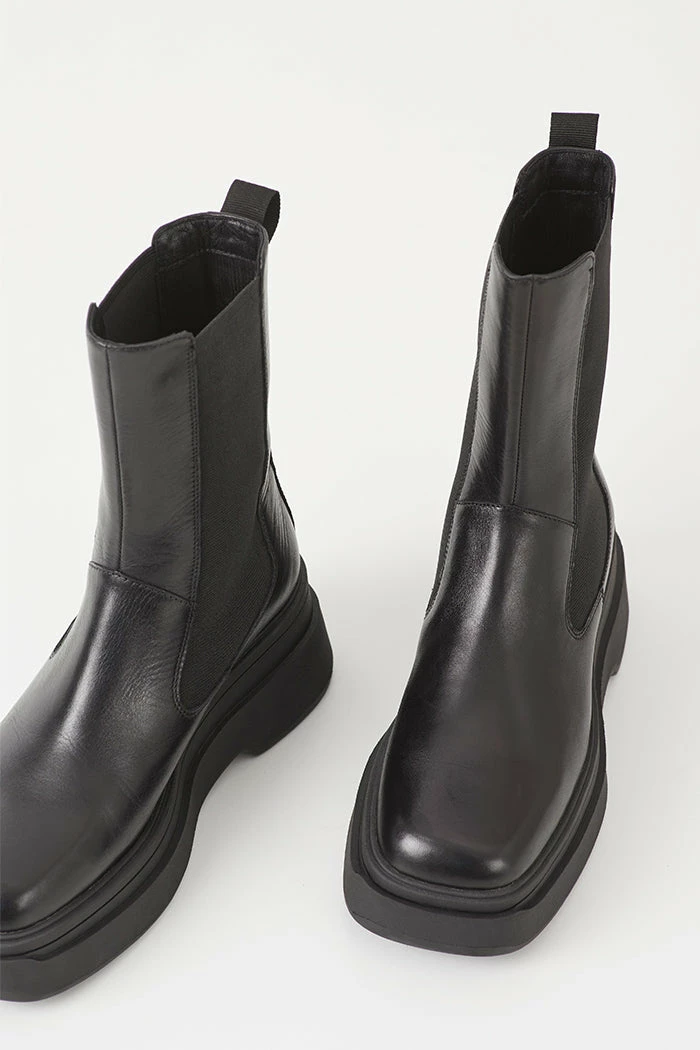 Vagabond Carla chunky, square toe, smooth black leather boot with elastic gores. These statement-making boots are designed with a mid-high shaft, and a solid sole measuring 69mm and sets out the next level of chunkiness this season.Â