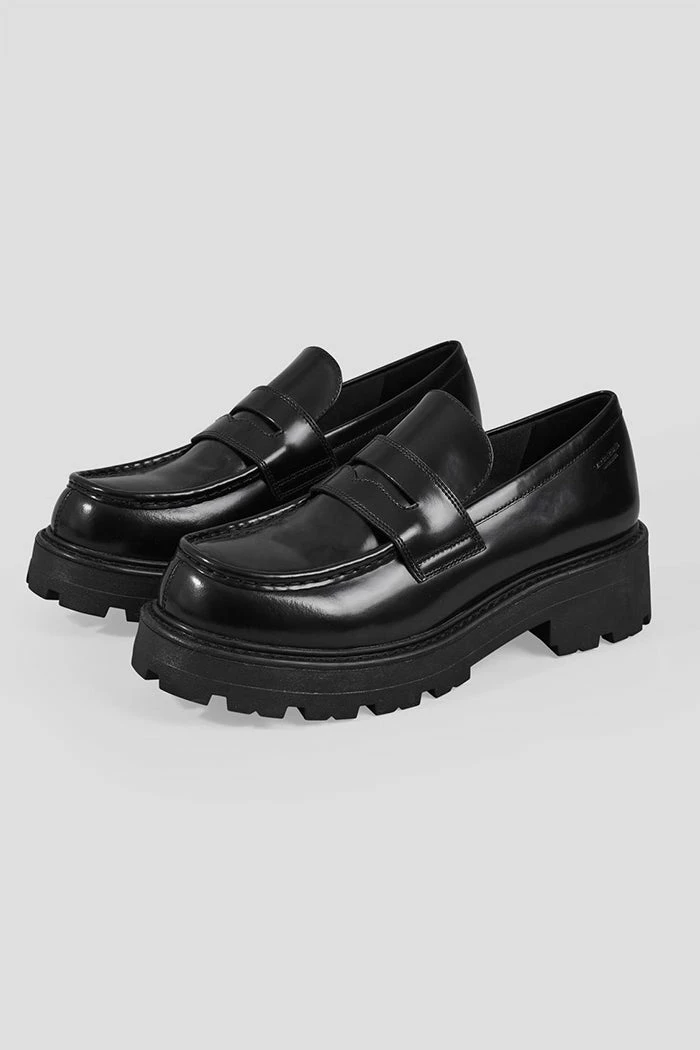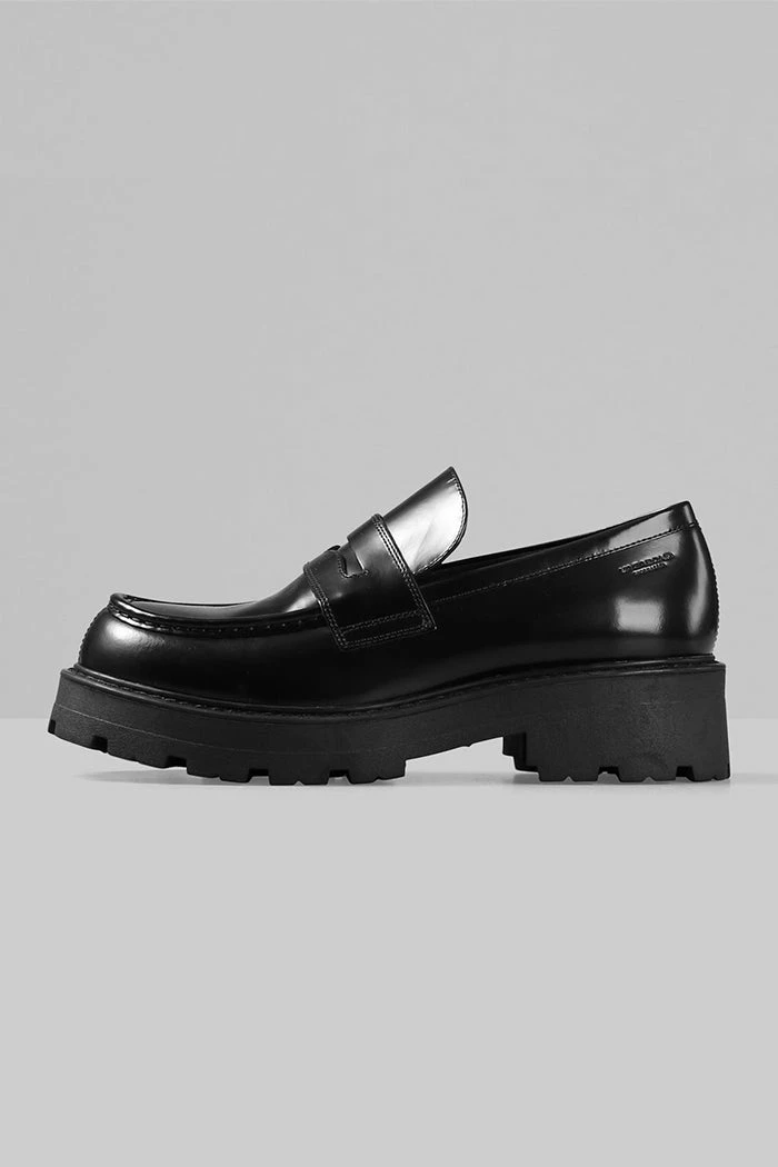 Vagabond Cosmo 2.0 chunky loafer in polished black leather. The all-black upper is made from smooth, leather set on a 45mm heel for a subtle lift. Details include the classic, visible stitching and the contoured penny straps across the foot.