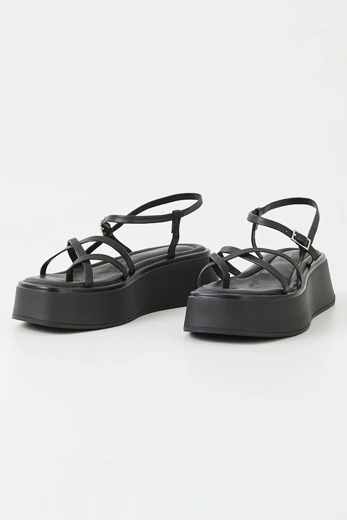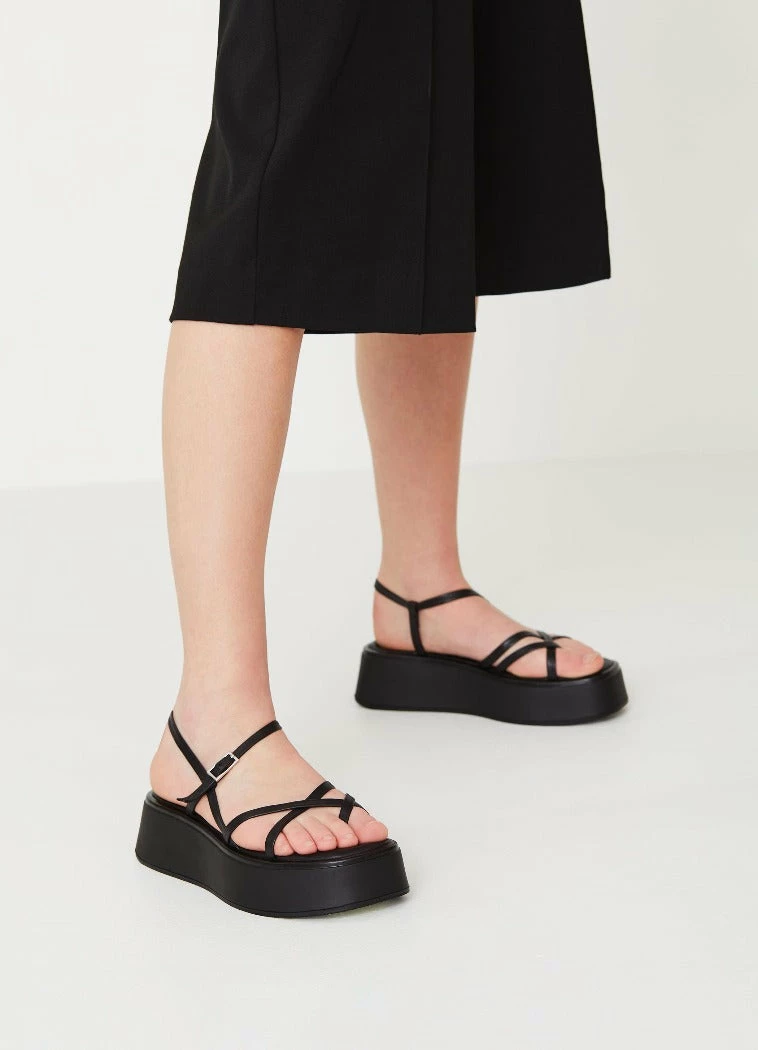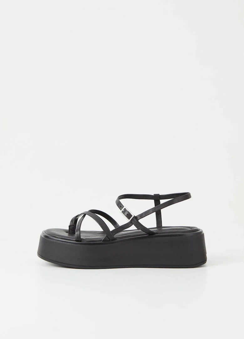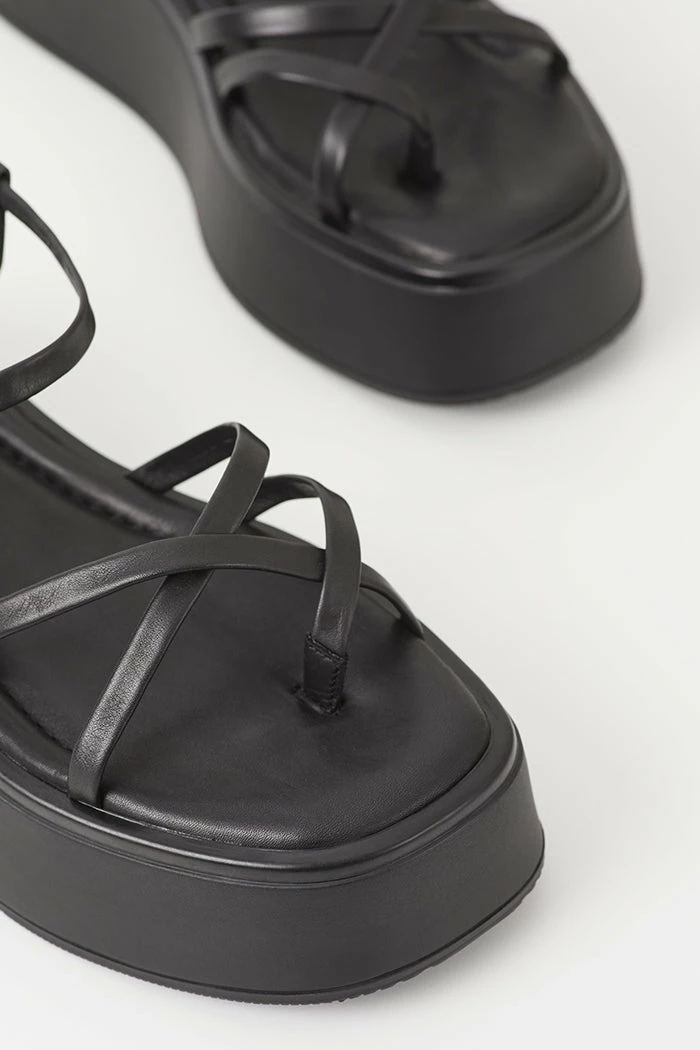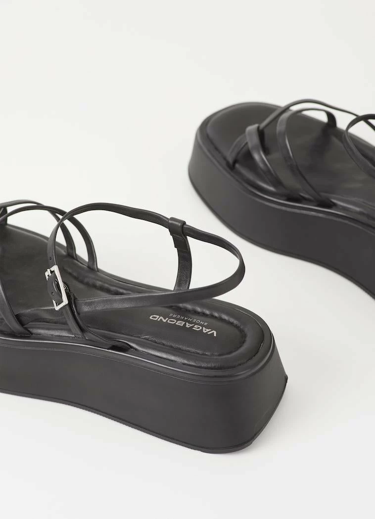 Vagabond Courtney strappy platform sandals. It is all about the characteristic flared outsole that make this style the ultimate sandal of the season. The minimalistic upper, made from slender black leather straps, beautifully frame the foot and fastens around the ankle for a secure fit. The strappy upper, set on 50 mm flatform soles, is completed with a cushioned footbed, pin-buckle fastening and squared-off toes.