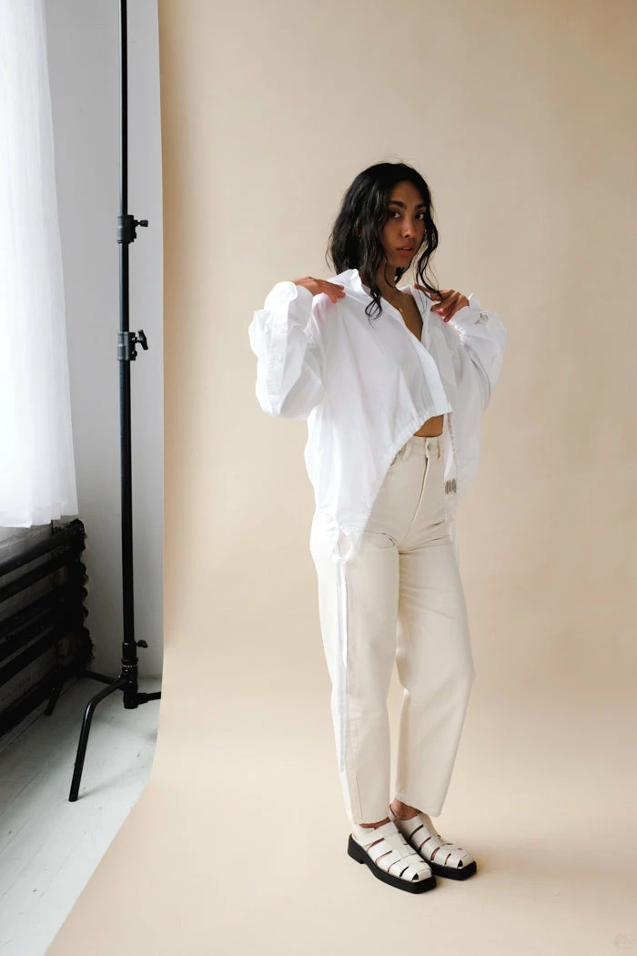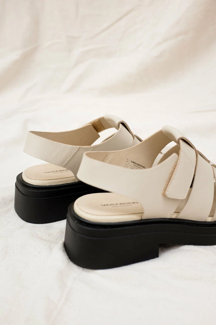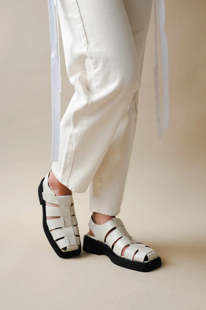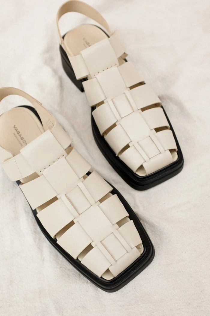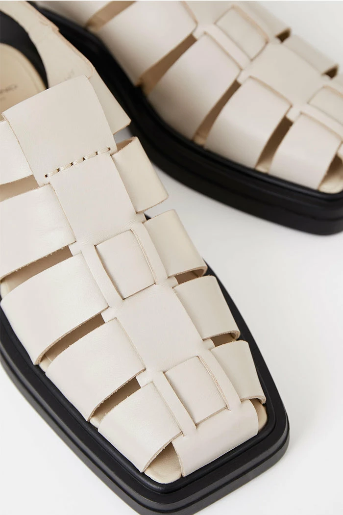 Vagabond Eyra fisherman sandal in off white smooth leather. Featuring a woven design, adjustable ankle straps and boxy square toes. The contrast-colored rubber outsoles measure 45mm.