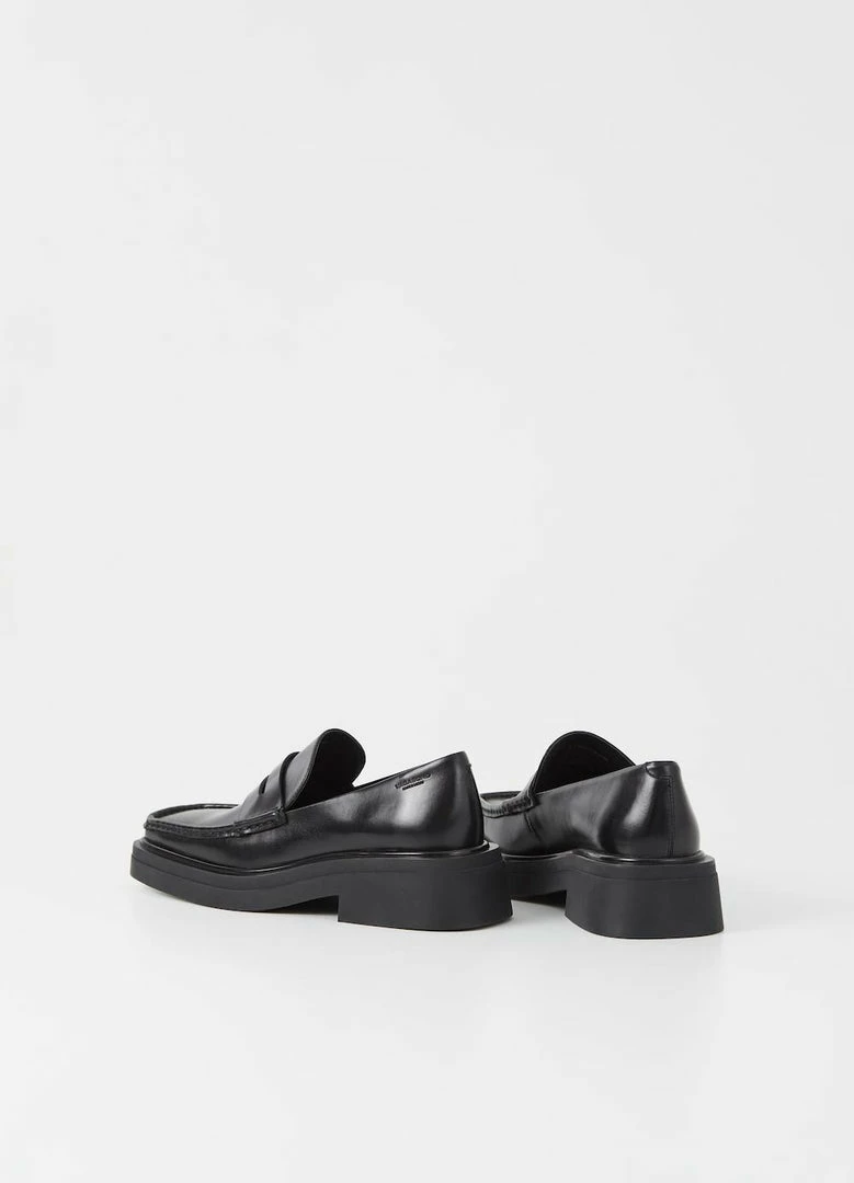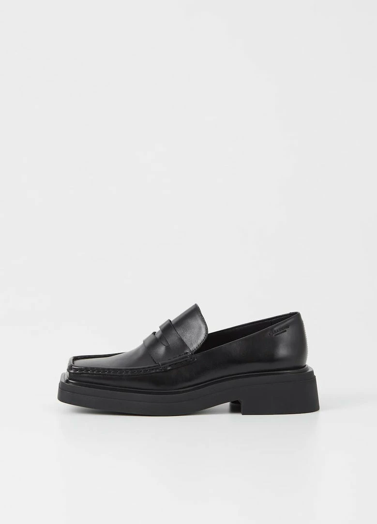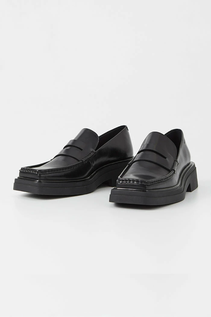 Vagabond Eyra polished black leather, square toe, penny loafers. The transeasonal piece that will elevate your loafer-edit this season. The solid outsoles and sharp squared toes provides a contemporary edge suitable for any occasion.