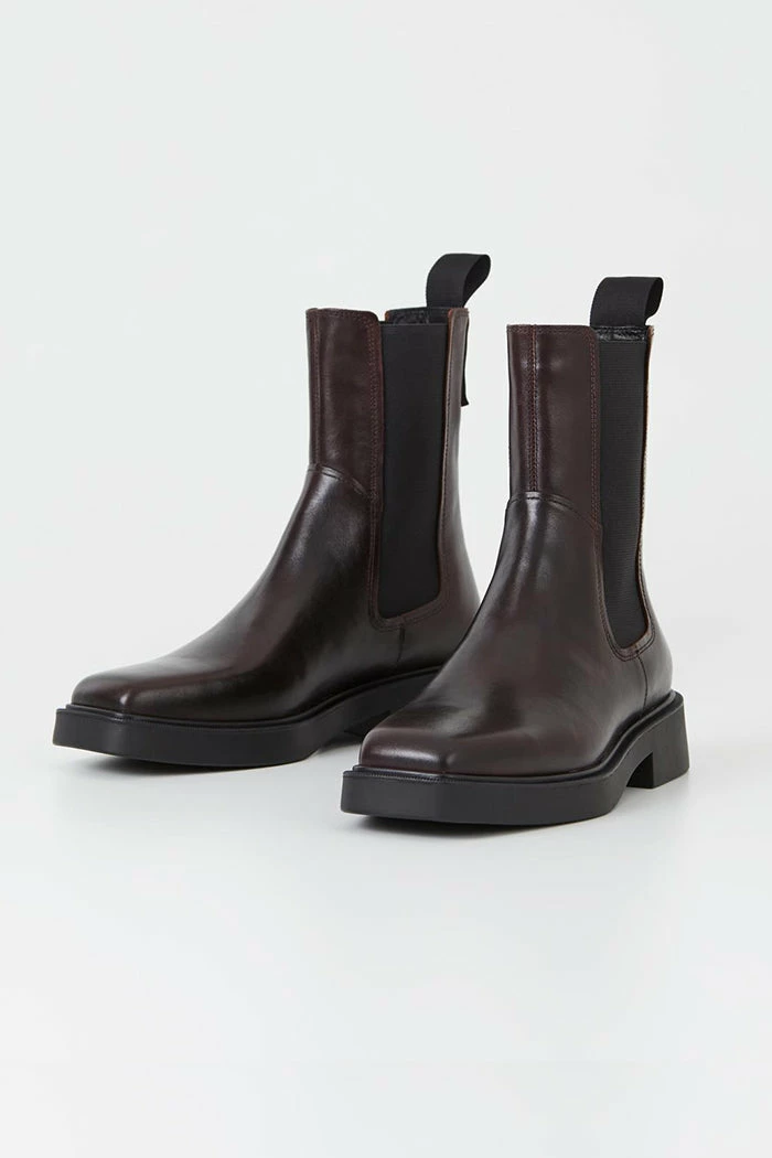 Vagabond Jillian java dark brown leather square toed boots. Jillian brings a modern take on classic chelsea boots. Crafted in brown leather, the mid-high shaft has elastic side panels for great wearability. The squared toe and solid outsoles brings a contemporary look in line with this season’s heavyset silhouettes. Other details include decorative upper seams and pull-on tabs.