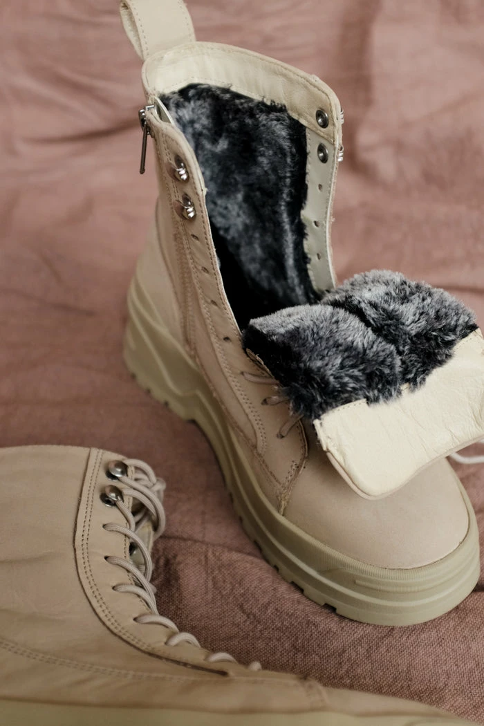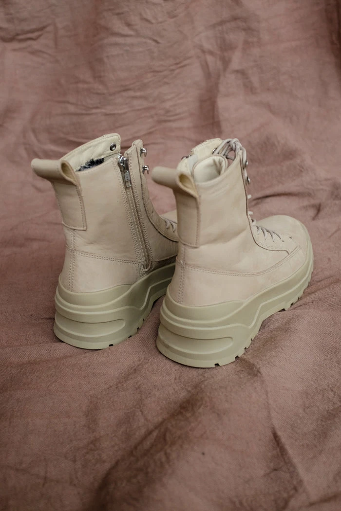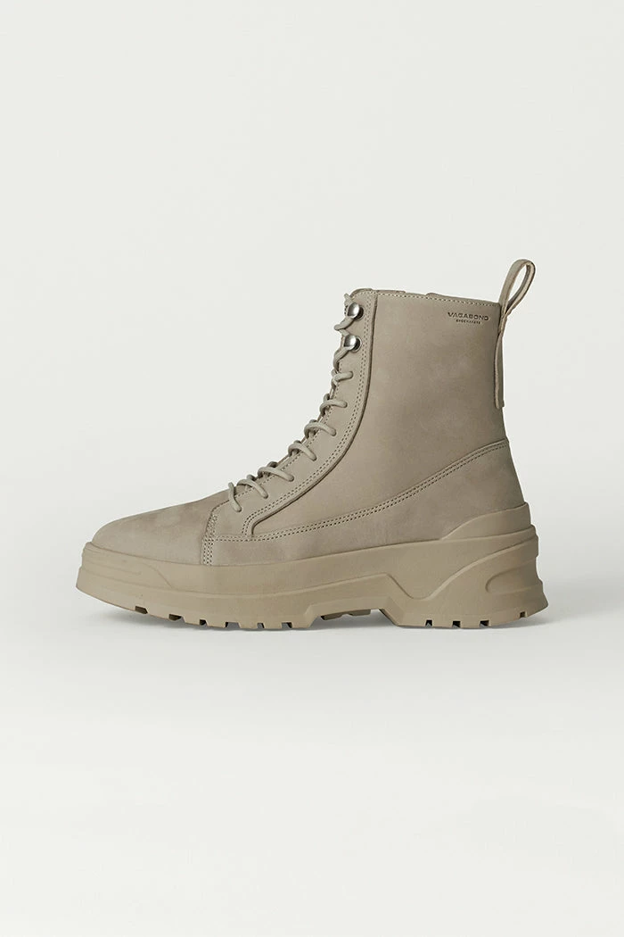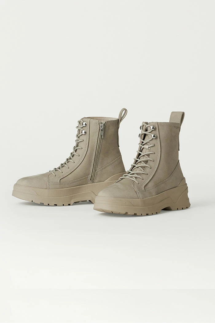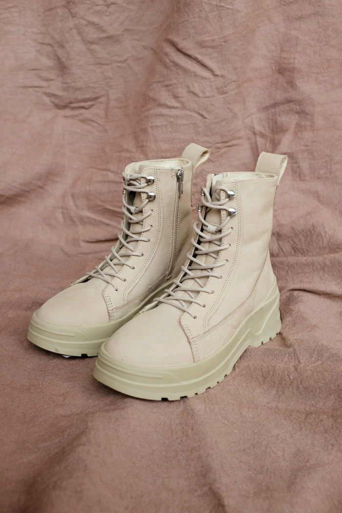 Vagabond Maxime utility, chunky, waterproof leather combat boots in sueded sand. Crafted in water-proof leather, the mid-rise shaft features lace-up fastening and inside zippers for a great fit.